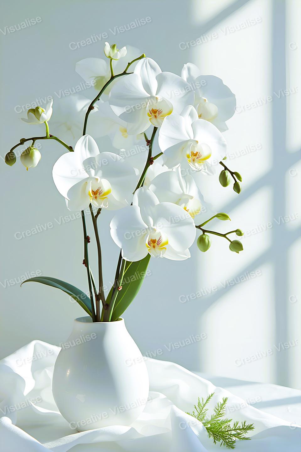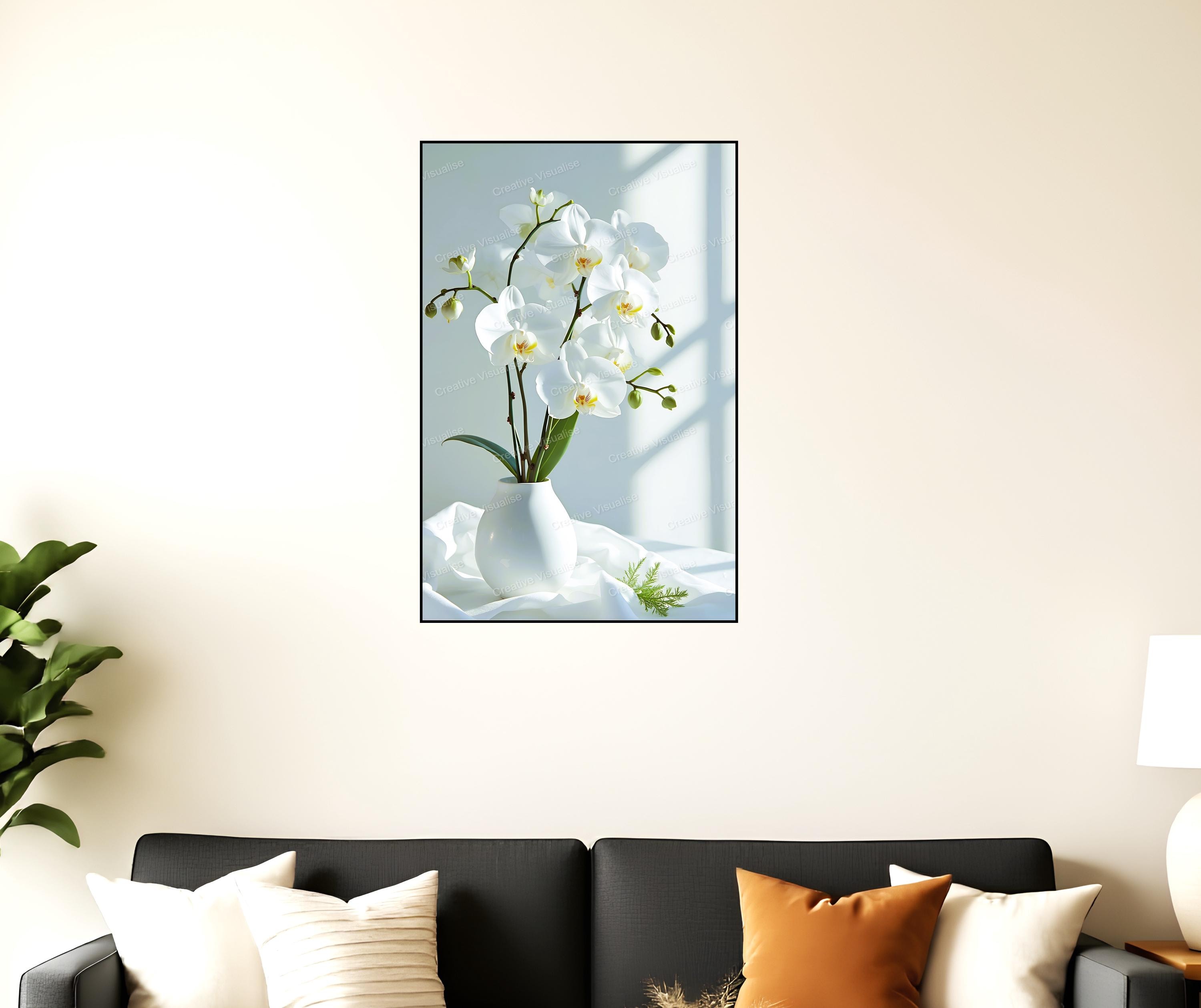 A digital photo of a white orchid bouquet of flowers with a vase that can be easily downloaded and printed. It is large enough for professional posters, canvas prints, and wall decor. The sizes of received digital files: 1. PNG file, 5300×8000 pixels 2. PDF 4:5, 16×20 (8×10 and 4×6) inches 3. PDF 3:4, 18×24 (12×16 and 6×8) inches 4. PDF A2 (16.5×23.4 inches) 5. PDF 2:3, 16×24 (12×18 and 8×12) inches All files are high-resolution 300 DPI professional quality, ensuring crisp and clear prints at every size. For commercial use, please send me a message.