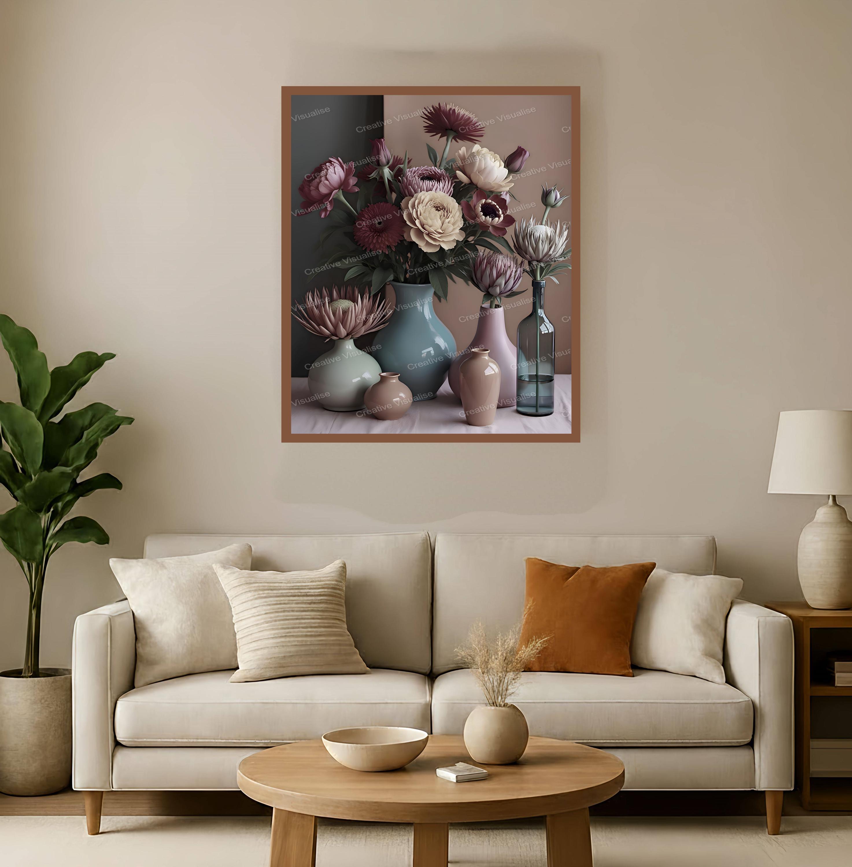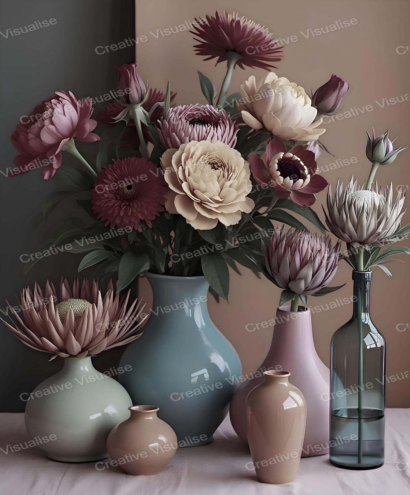5 digital photos of bouquets of flowers with pots that can be easily downloaded and printed (not a physical item for delivery). The details of the digitally received image are about 11000 × 16000 pixels, 300 DPI, JPEG and PDF formats, AI artwork, very high resolution without a watermark, and large enough for professional posters, canvas prints, and wall decor. Please send me a message if you need another file format after the original files' delivery. This price is for personal use! For commercial use, please send me a message.