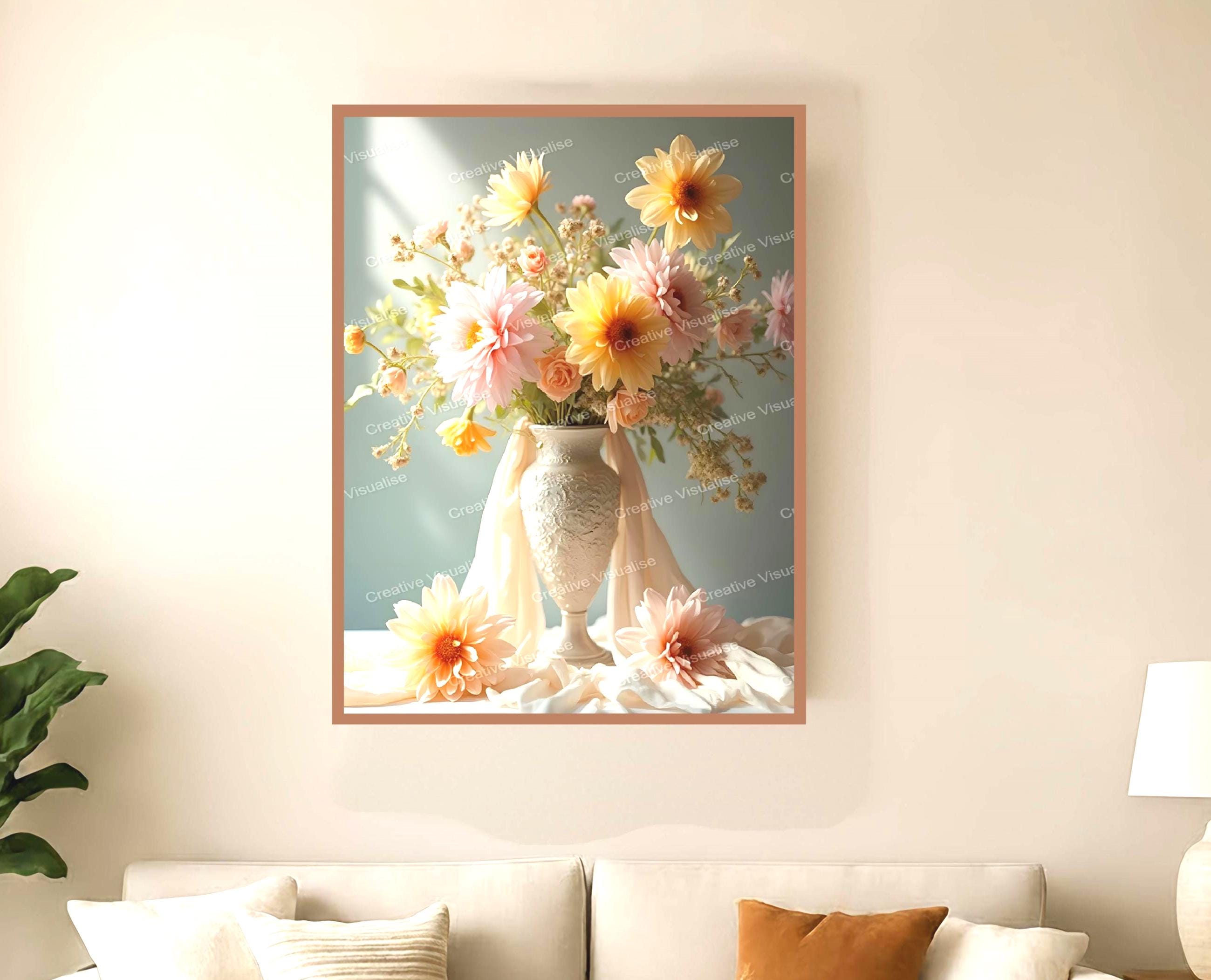 A digital photo of a bouquet of flowers in a vase that can be easily downloaded and printed (not a physical item for delivery). The details of the digitally received image are about 11000 × 16000 pixels, 300 DPI, JPEG and PDF formats, AI artwork, very high resolution without a watermark, and large enough for professional posters, canvas prints, and wall decor. Please send me a message if you need another file format after the original files' delivery. This price is for personal use! For commercial use, please send me a message.