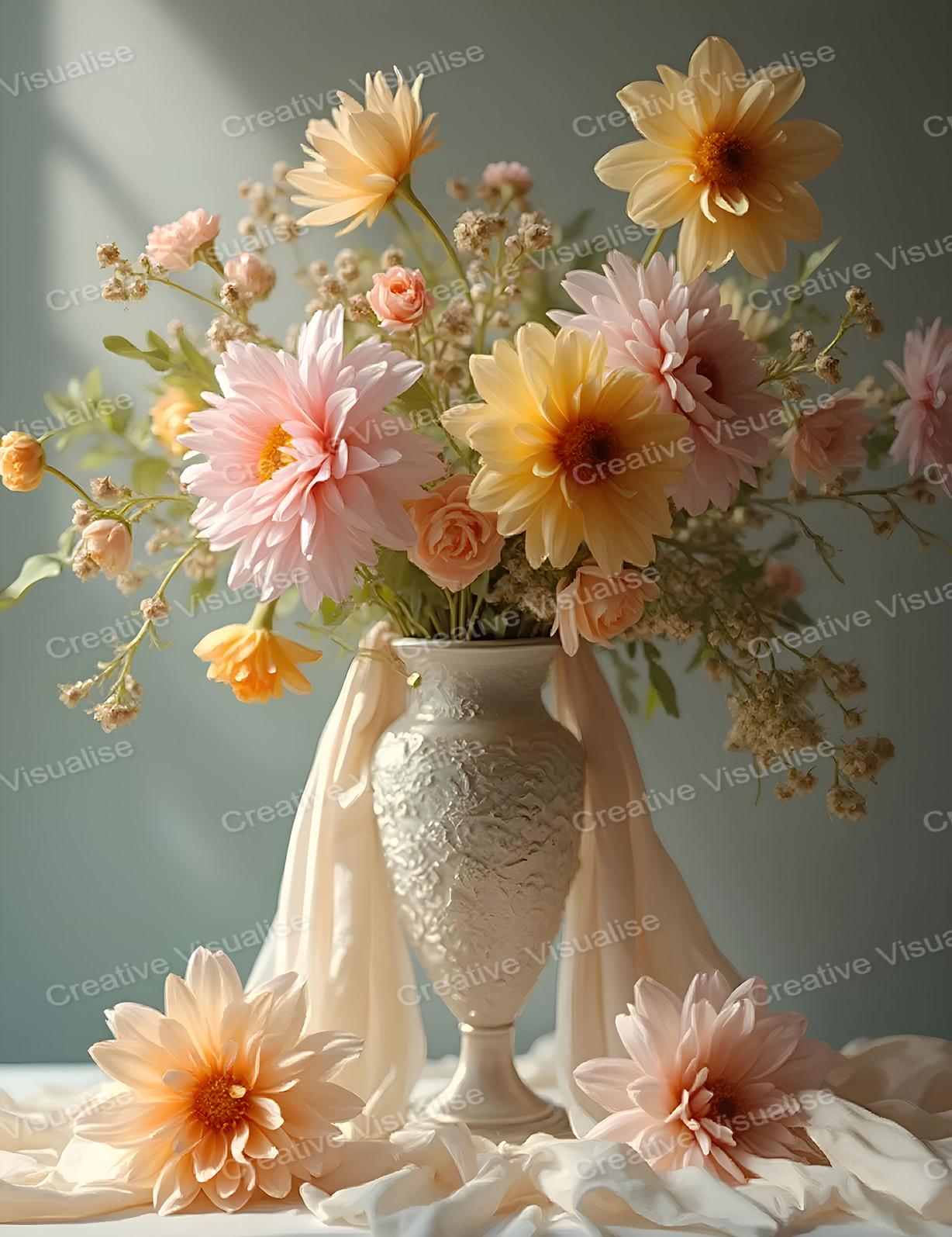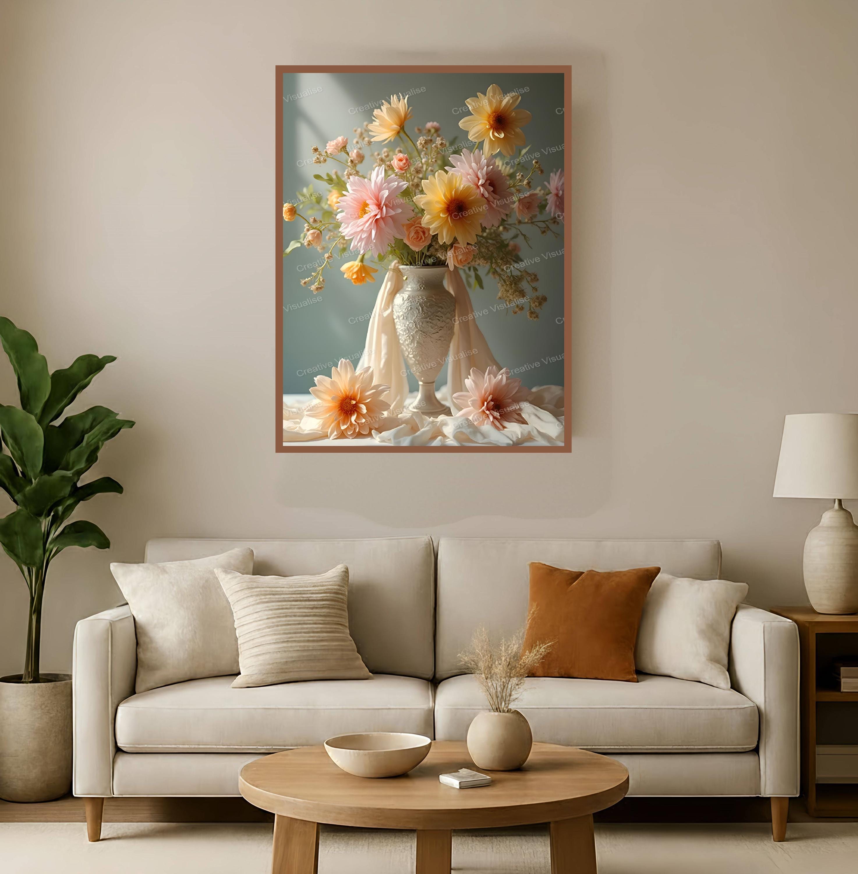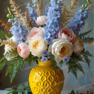 A digital photo of a bouquet of flowers in a vase that can be easily downloaded and printed (not a physical item for delivery). The details of the digitally received image are about 11000 × 16000 pixels, 300 DPI, JPEG and PDF formats, AI artwork, very high resolution without a watermark, and large enough for professional posters, canvas prints, and wall decor. Please send me a message if you need another file format after the original files' delivery. This price is for personal use! For commercial use, please send me a message.