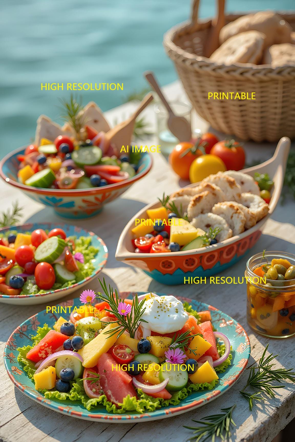 A digital photo of ruby red dishes in a beach restaurant that can be easily downloaded and printed (not a physical item for delivery). The details of the digitally received image are about 5000 × 8000 pixels, 300 DPI, AI artwork, very high resolution without a watermark, and large enough for professional posters, canvas prints, and wall decor. This price is for personal use, not for commercial use!