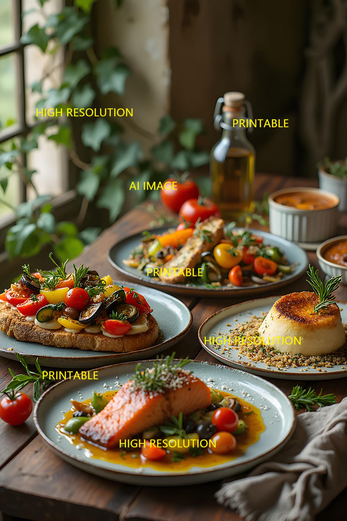 A digital photo of food dishes that can be easily downloaded and printed (not a physical item for delivery). The details of the digitally received image are about 5000 × 8000 pixels, 300 DPI, AI artwork, very high resolution without a watermark, and large enough for professional posters, canvas prints, and wall decor. This price is for personal use, not for commercial use!