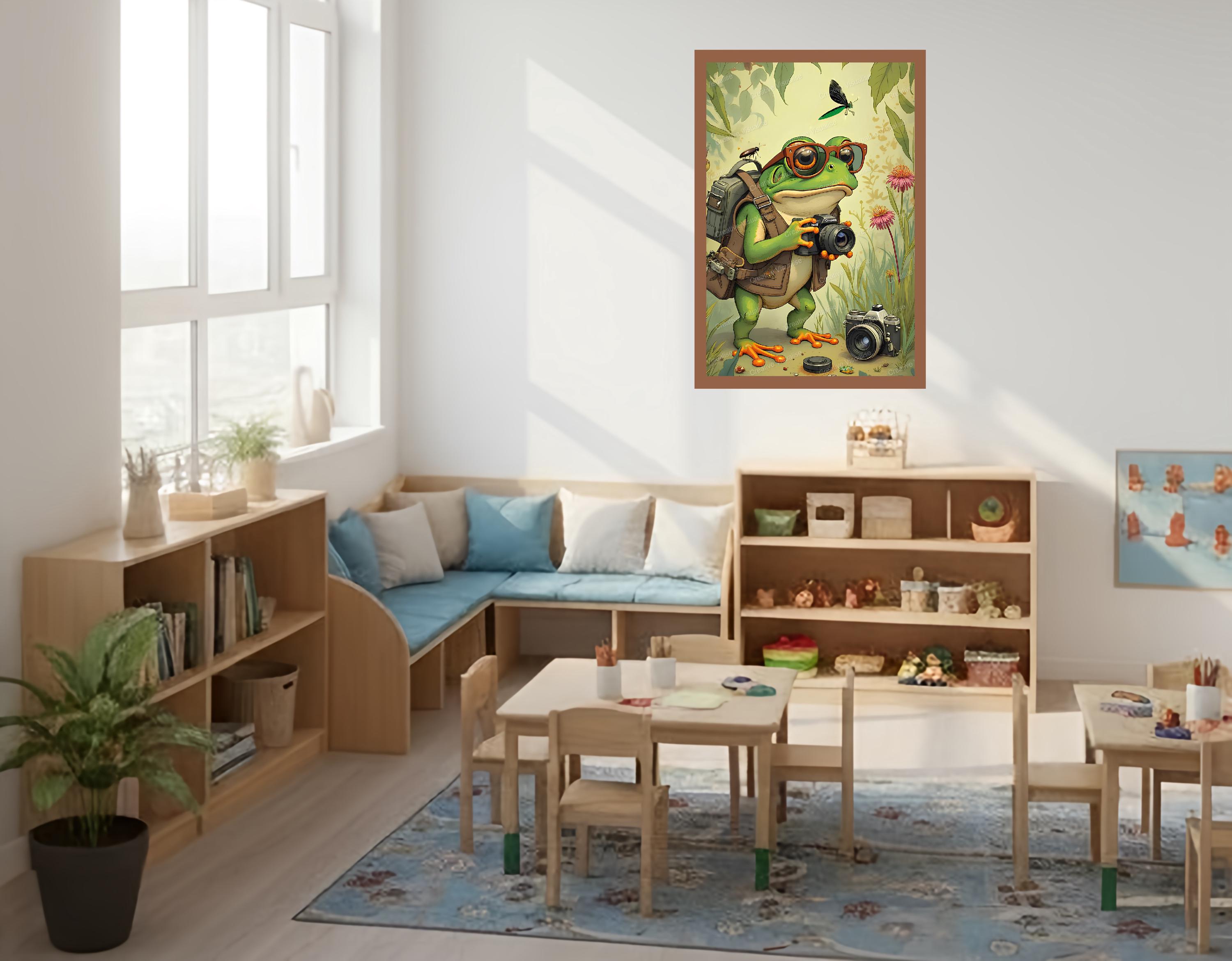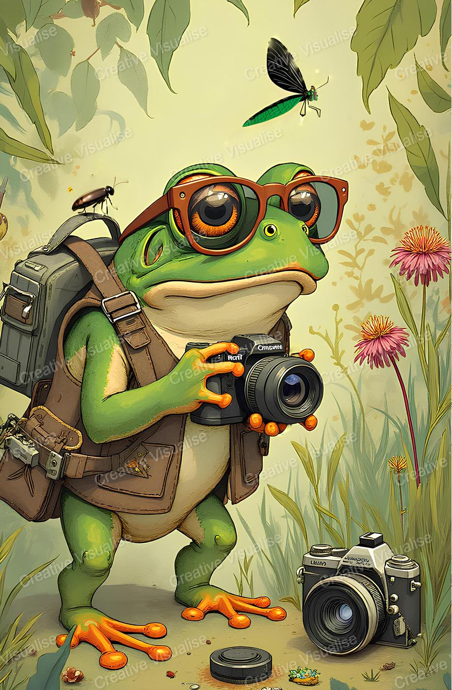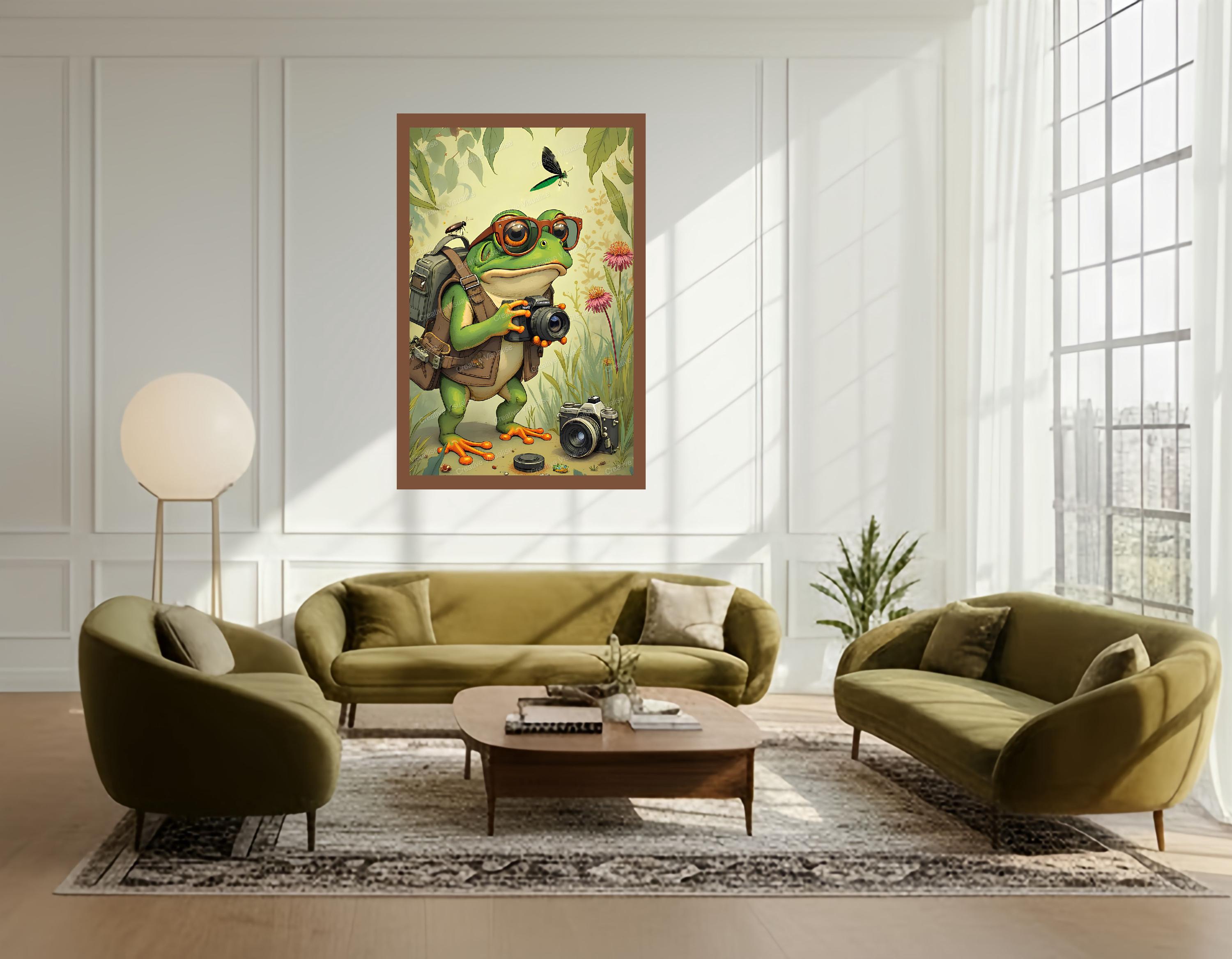 A digital photo of a nature photographer fantasy frog that can be easily downloaded and printed (not a physical item for delivery). The details of the digitally received image are about 5000 × 7000 pixels, 300 DPI, AI artwork, very high resolution without a watermark, and large enough for professional posters, canvas prints, and wall decor. This price is for personal use! For commercial use, please send me a message.