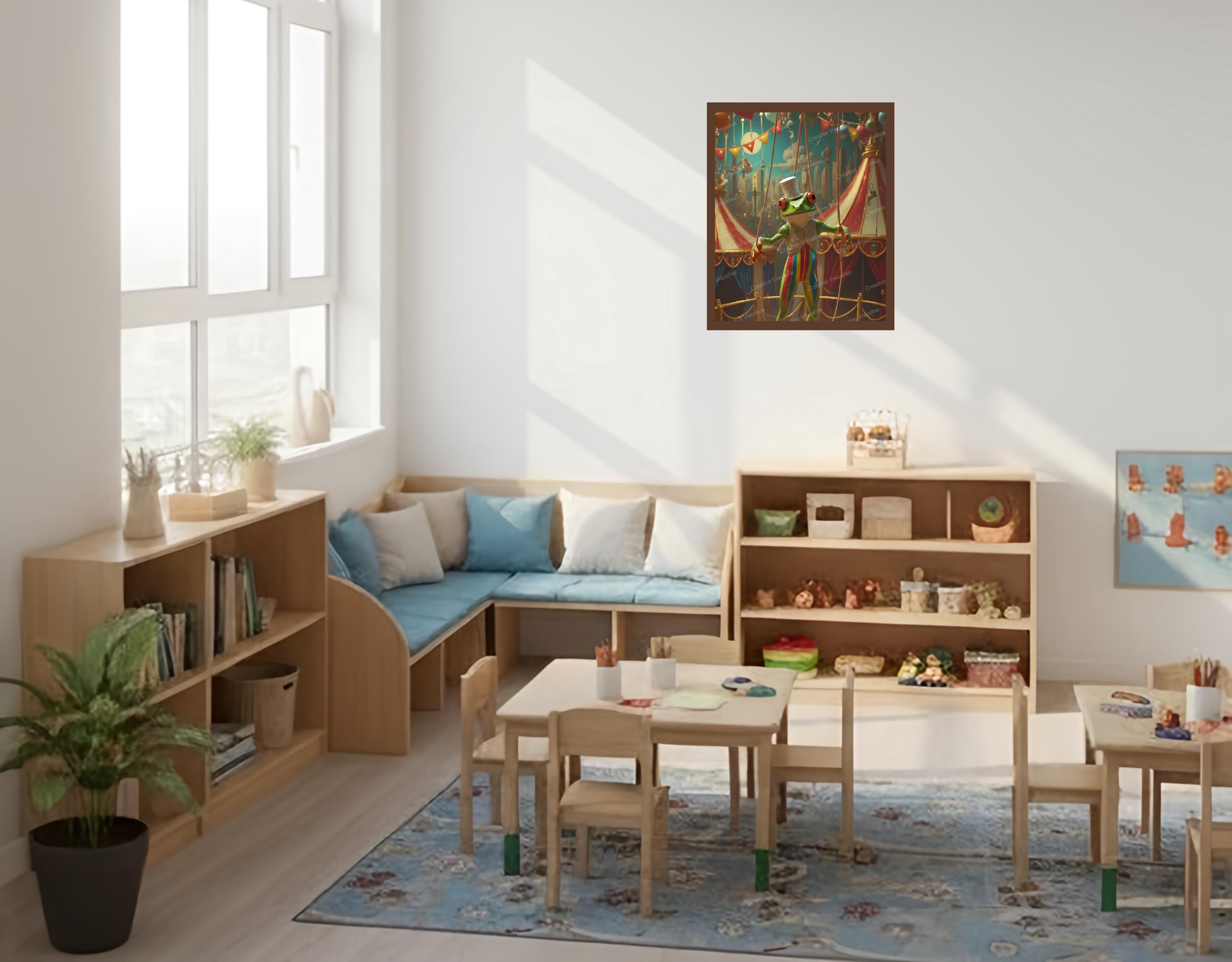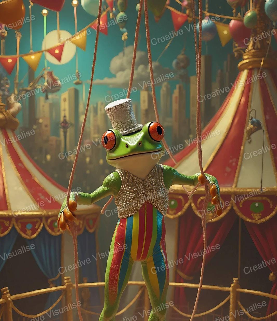 A digital photo of an acrobatic frog in the circus that can be easily downloaded and printed (not a physical item for delivery). The details of the digitally received image are about 7000 × 9000 pixels, 300 DPI, AI artwork, very high resolution without a watermark, and large enough for professional posters, canvas prints, and wall decor. This price is for personal use! For commercial use, please send me a message.