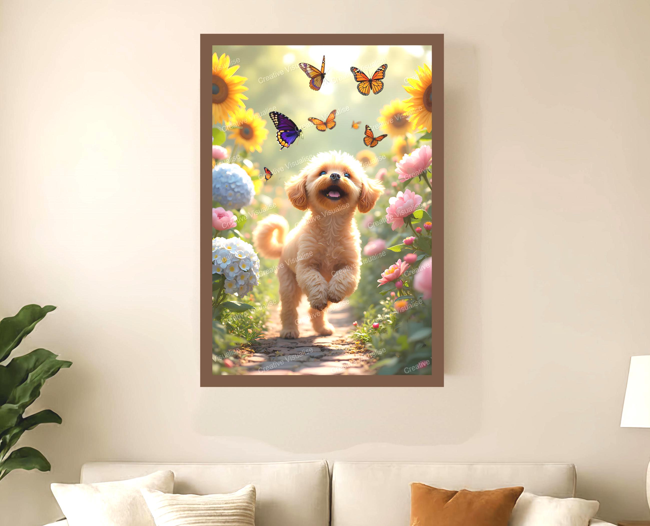 A digital photo of maltipoo dog art with the garden flowers and butterflies that can be easily downloaded and printed (not a physical item for delivery). The details of the digitally received image are about 5000 × 8000 pixels, 300 DPI, JPEG and PDF formats, AI artwork, very high resolution without a watermark, and large enough for professional posters, canvas prints, and wall decor. Please send me a message if you need another file format after the original files' delivery. This price is for personal use! For commercial use, please send me a message.