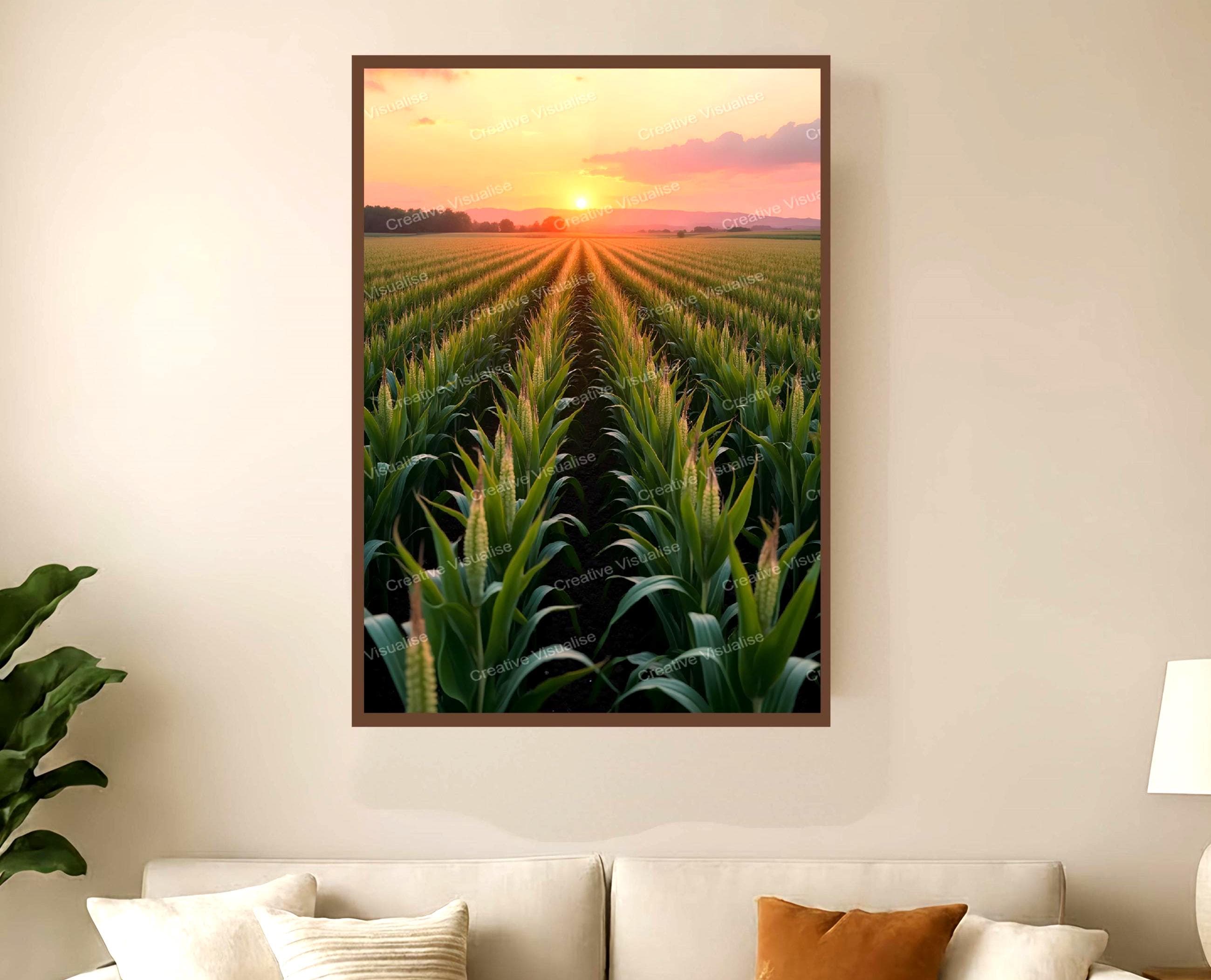 A sunset in the cornfield landscape wall art digital print that can be easily downloaded and printed (not a physical item for delivery). The details of the digitally received images are about 11000 × 16000 pixels, 300 DPI, JPEG and PDF formats, AI artwork, very high resolution without a watermark, and large enough for professional posters, canvas prints, and wall decor. Please send me a message if you need another file format after the original files' delivery. This price is for personal use! For commercial use, please send me a message.