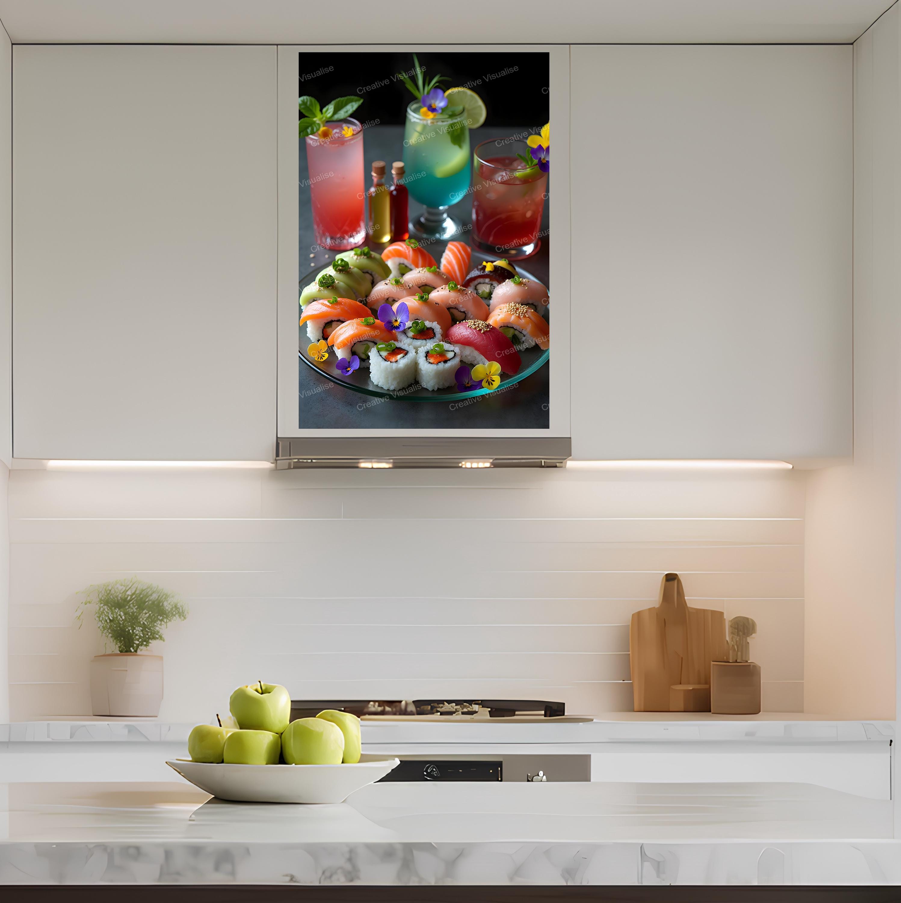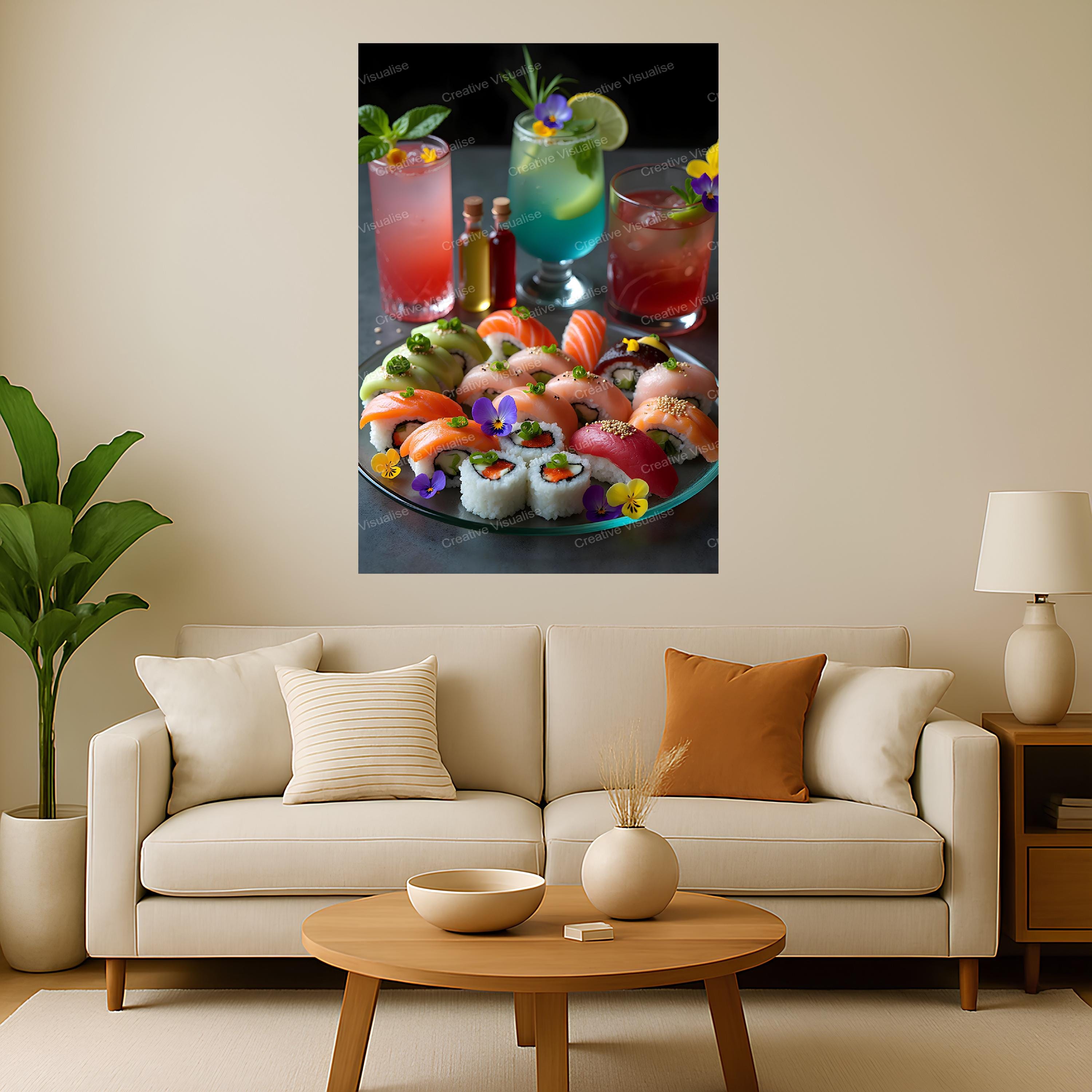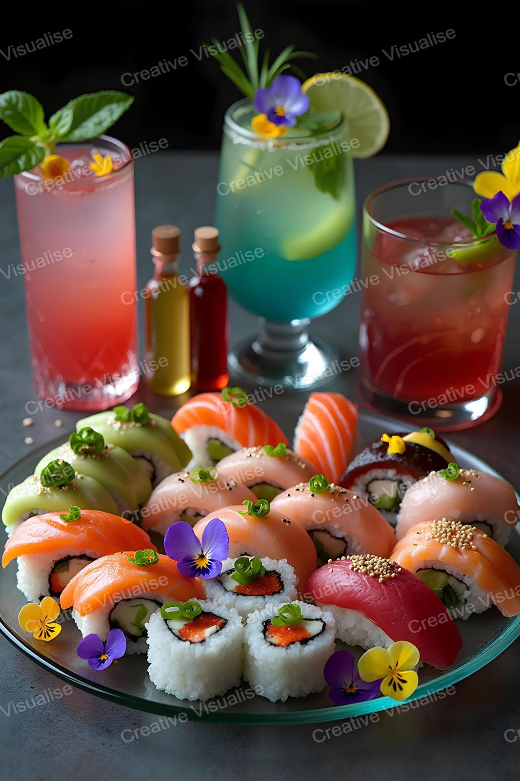 A table of sushi and drinks: High-Resolution Digital Prints (11000x16000 pixels, 300 DPI, JPEG-PDF)