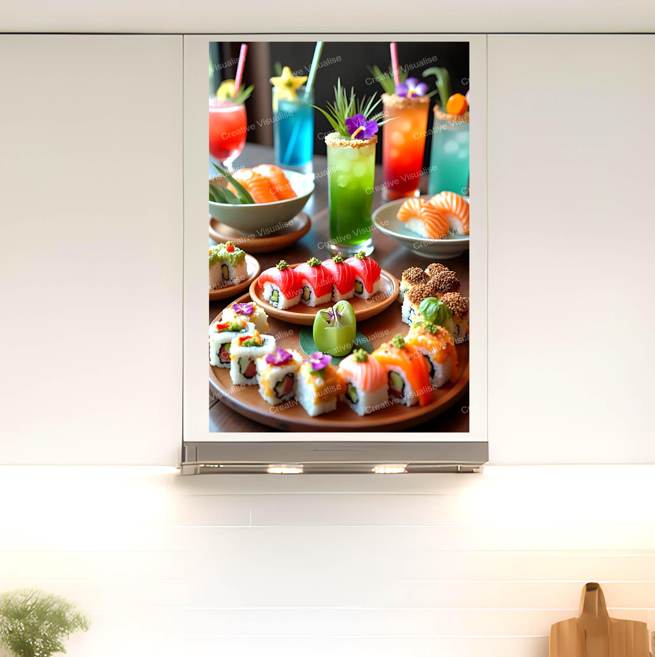 A table of sushi and drinks that can be easily downloaded and printed (not a physical item for delivery). The details of the digitally received image are about 11000 × 16000 pixels, 300 DPI, JPEG and PDF formats, AI artwork, very high resolution without a watermark, and large enough for professional posters, canvas prints, and wall decor. Please send me a message if you need another file format after the original files' delivery. This price is for personal use! For commercial use, please send me a message.