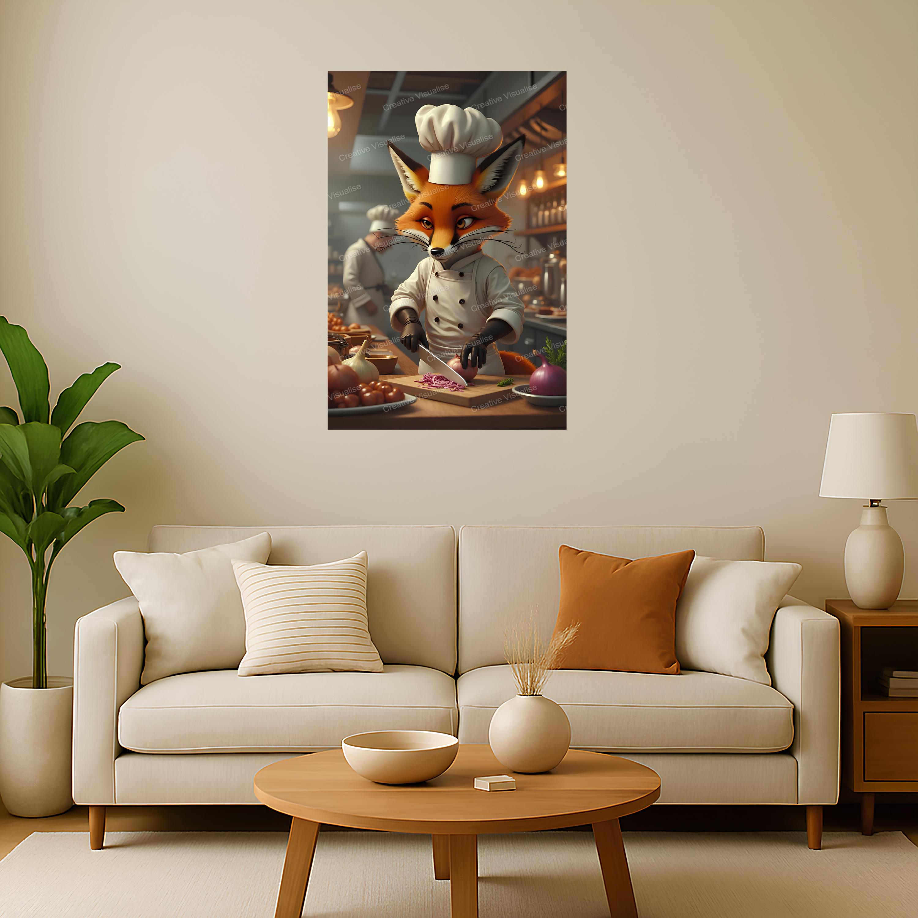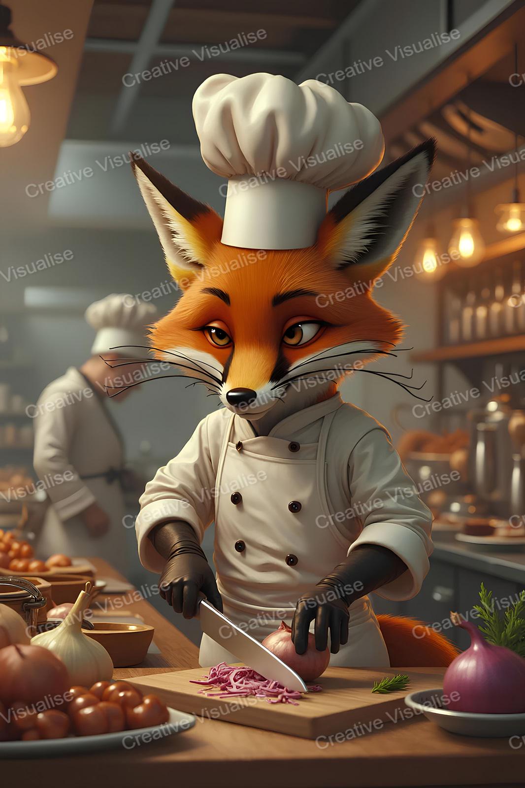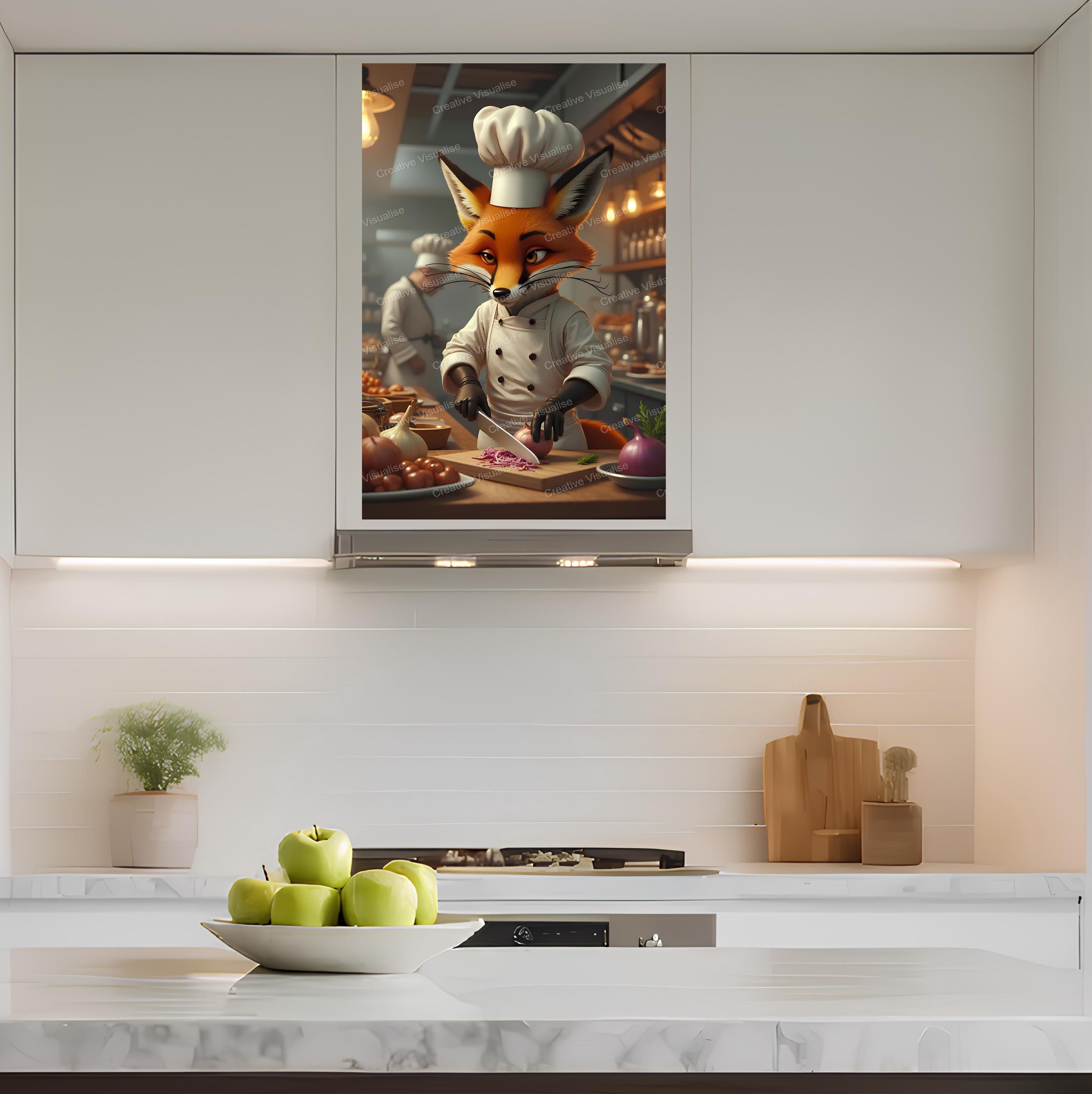 A digital photo of Chef Fox that can be easily downloaded and printed (not a physical item for delivery). The details of the digitally received image are about 11000 × 16000 pixels, 300 DPI, JPEG and PDF formats, AI artwork, very high resolution without a watermark, and large enough for professional posters, canvas prints, and wall decor. Please send me a message if you need another file format after the original files' delivery. This price is for personal use! For commercial use, please send me a message.