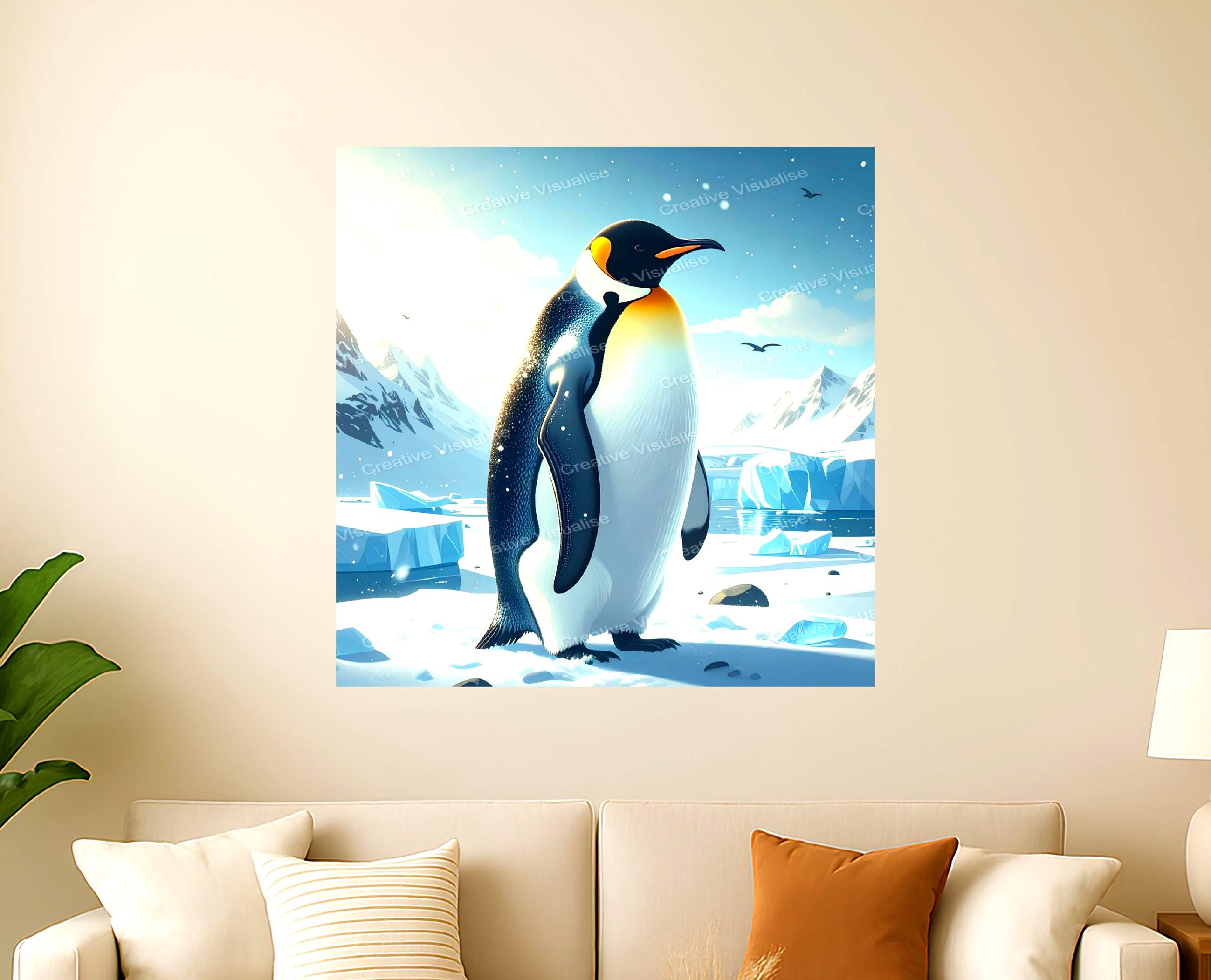 A digital photo of a penguin and snow tables that can be easily downloaded and printed (not a physical item for delivery). The details of the digitally received image are about 14000 × 14000 pixels, 300 DPI, JPEG and PDF formats, AI artwork, very high resolution without a watermark, and large enough for professional posters, canvas prints, and wall decor. Please send me a message if you need another file format after the original files' delivery. This price is for personal use! For commercial use, please send me a message.