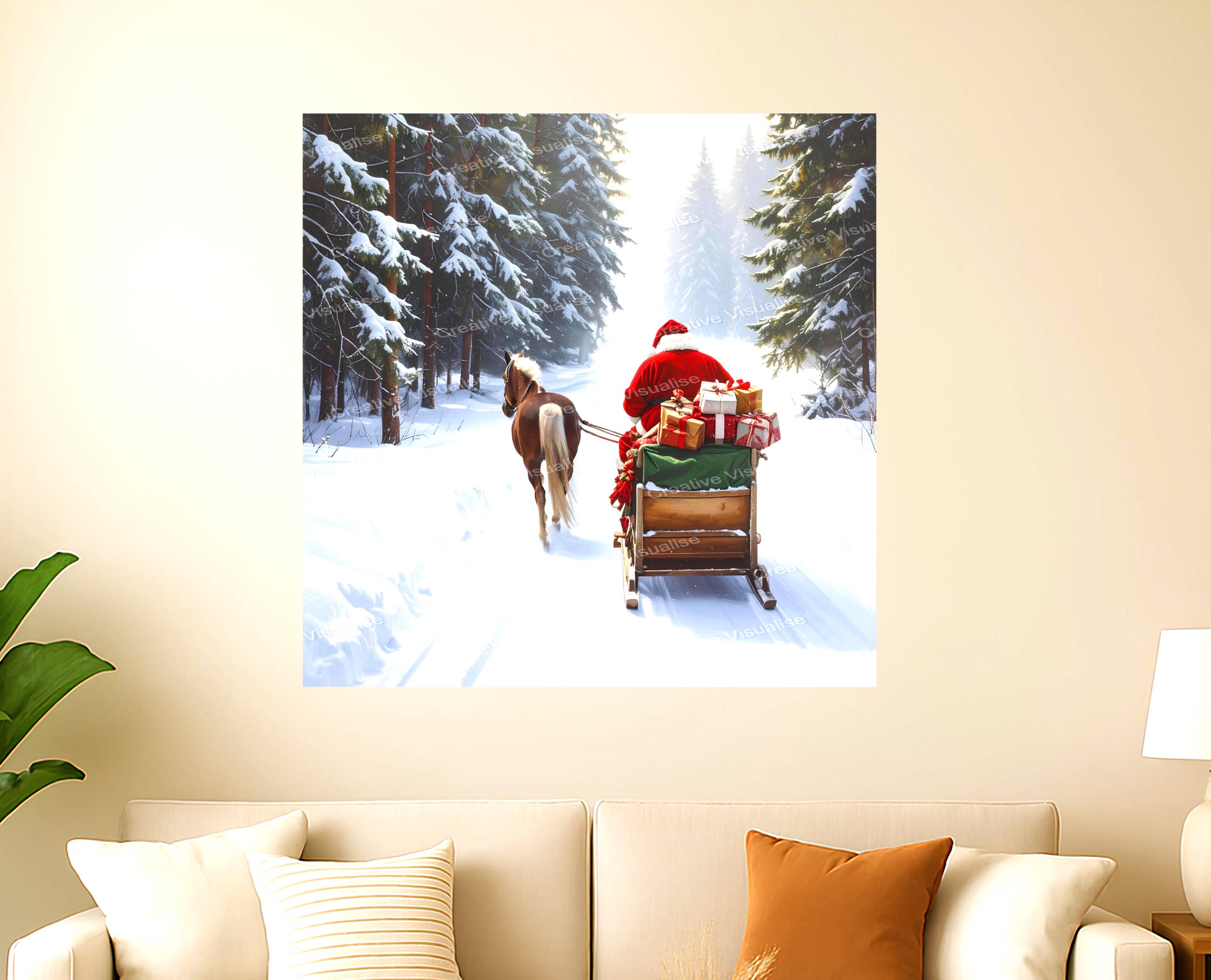 Santa Claus Riding Sleigh's Reindeer and Gifts on Snowy Pine Tree Path Christmas Art