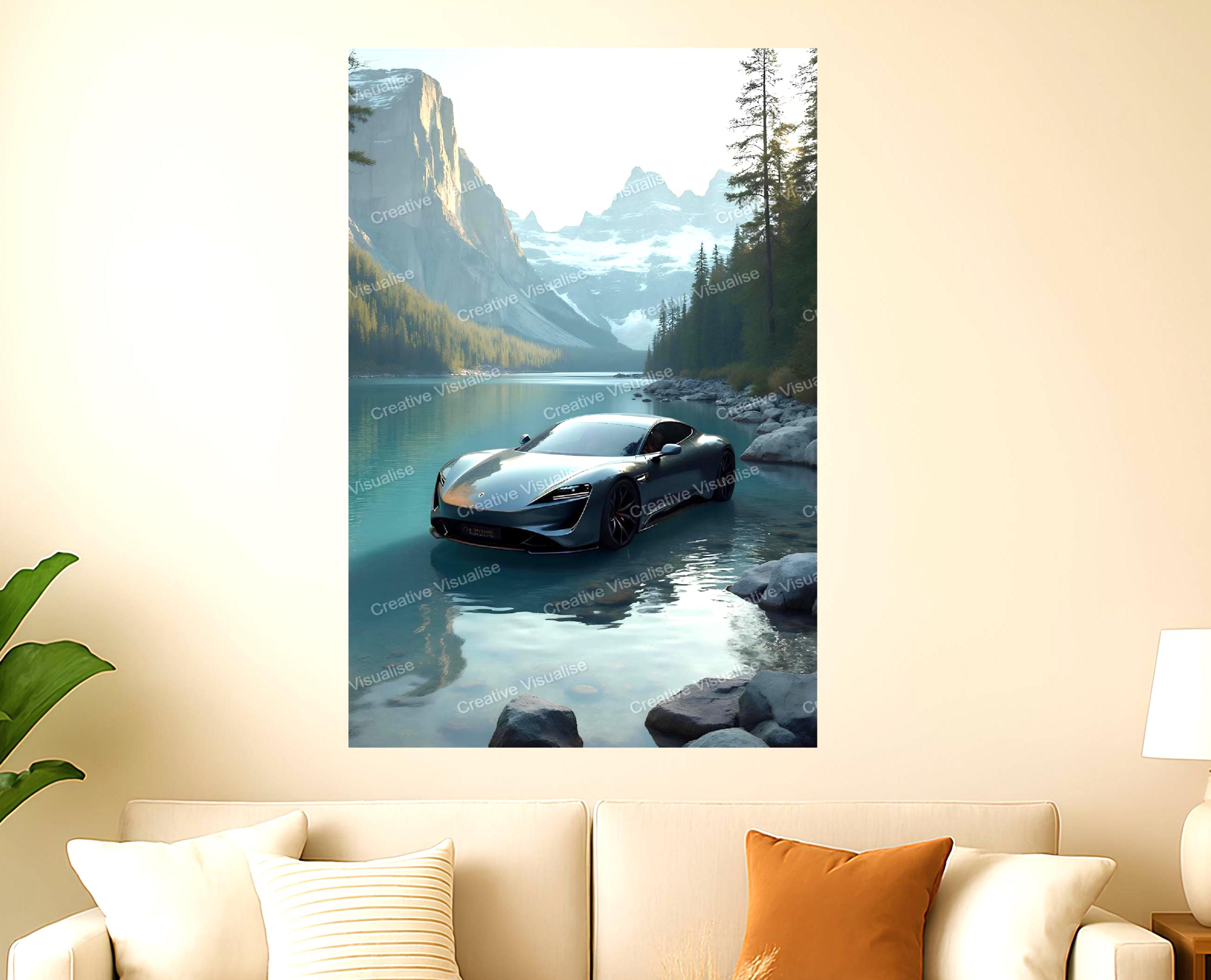 A digital photo of the car in the mountain lake landscape that can be easily downloaded and printed (not a physical item for delivery). The details of the digitally received image are about 11000 × 16000 pixels, 300 DPI, JPEG and PDF formats, AI artwork, very high resolution without a watermark, and large enough for professional posters, canvas prints, and wall decor. Please send me a message if you need another file format after the original files' delivery. This price is for personal use! For commercial use, please send me a message.