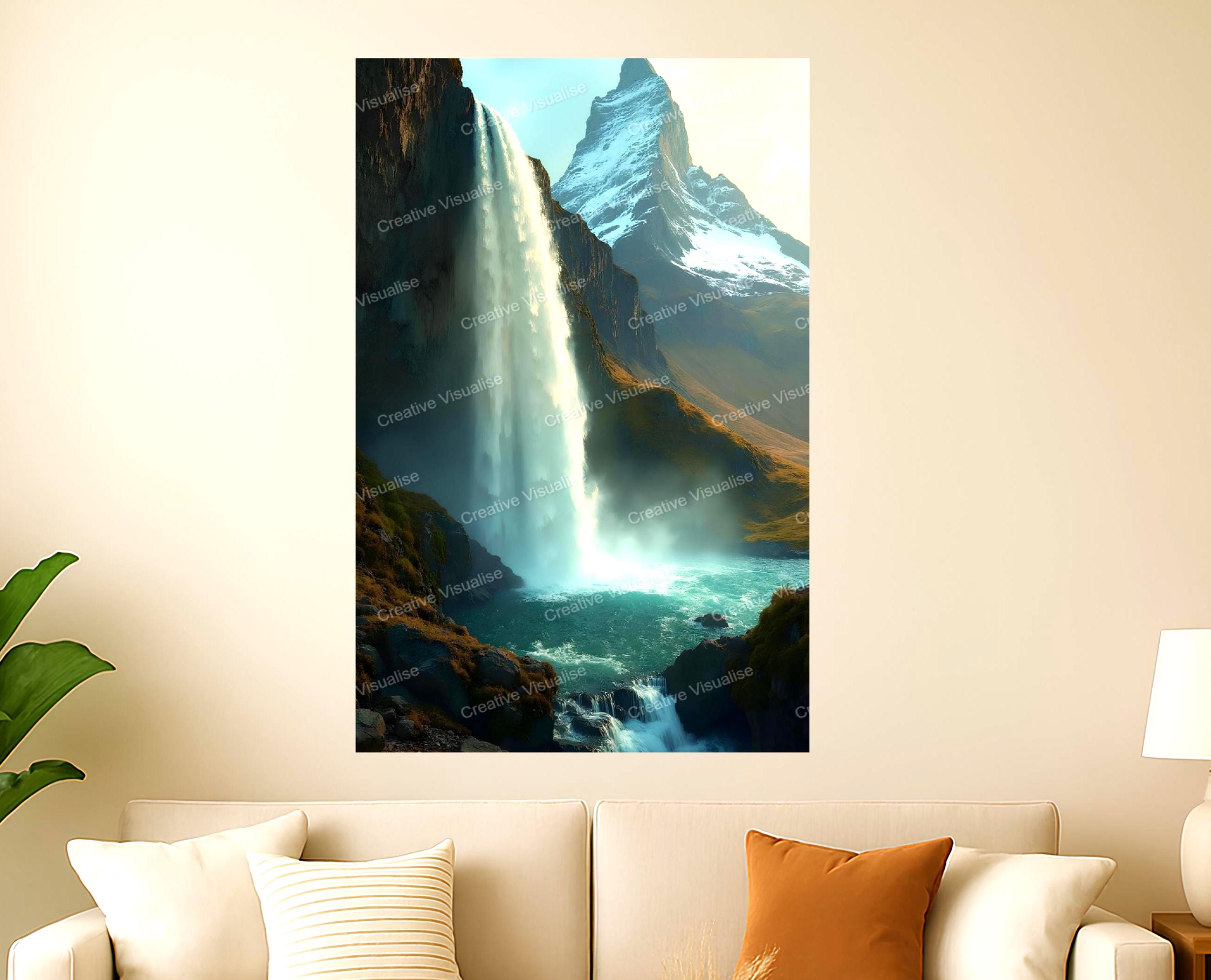 A digital photo of a mountains and waterfalls landscape that can be easily downloaded and printed (not a physical item for delivery). The details of the digitally received image are about 11000 × 16000 pixels, 300 DPI, JPEG and PDF formats, AI artwork, very high resolution without a watermark, and large enough for professional posters, canvas prints, and wall decor. Please send me a message if you need another file format after the original files' delivery. This price is for personal use! For commercial use, please send me a message.