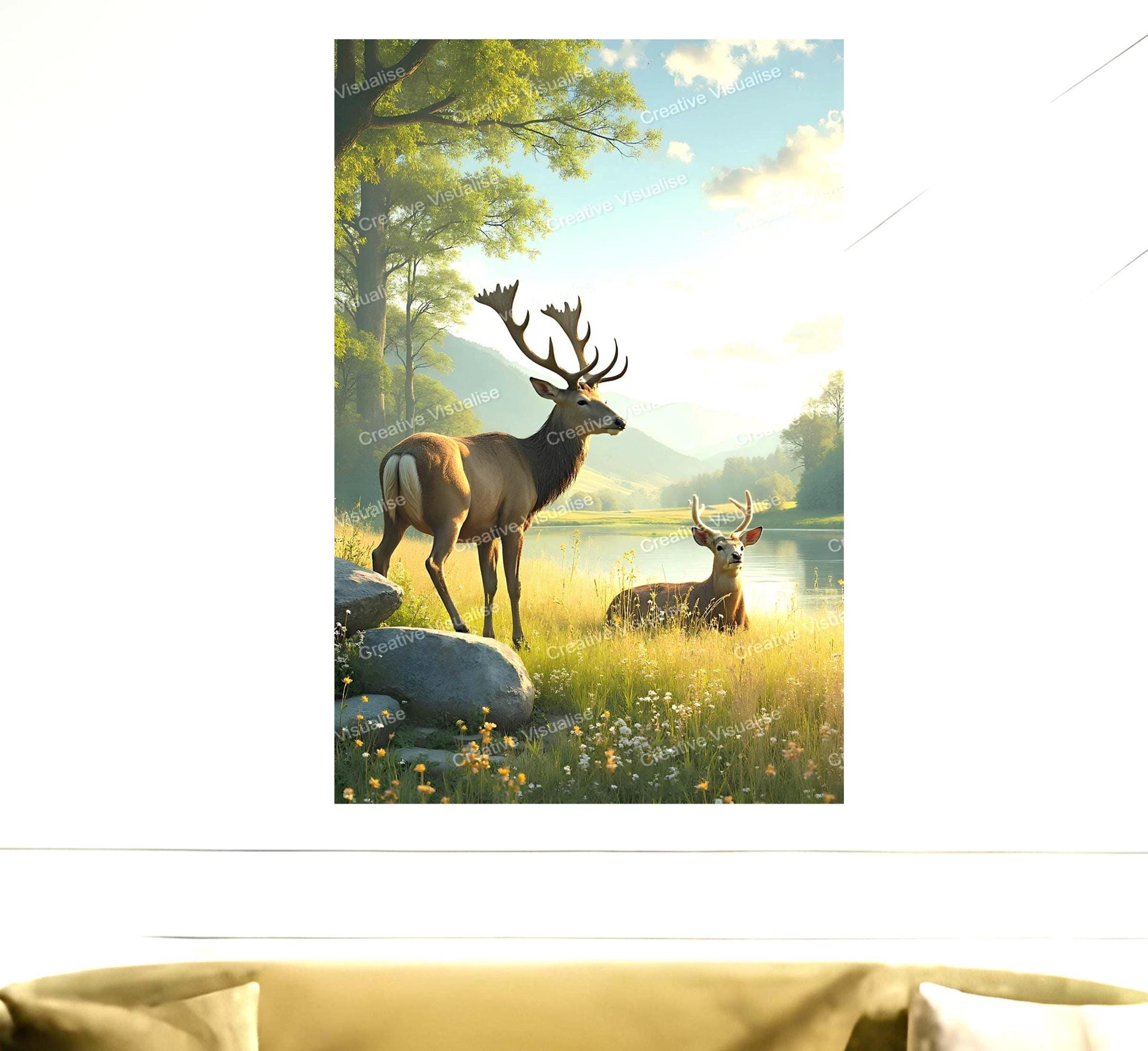 A digital photo of the deer by the river landscape that can be easily downloaded and printed (not a physical item for delivery). The details of the digitally received image are about 11000 × 16000 pixels, 300 DPI, JPEG and PDF formats, AI artwork, very high resolution without a watermark, and large enough for professional posters, canvas prints, and wall decor. Please send me a message if you need another file format after the original files' delivery. This price is for personal use! For commercial use, please send me a message.