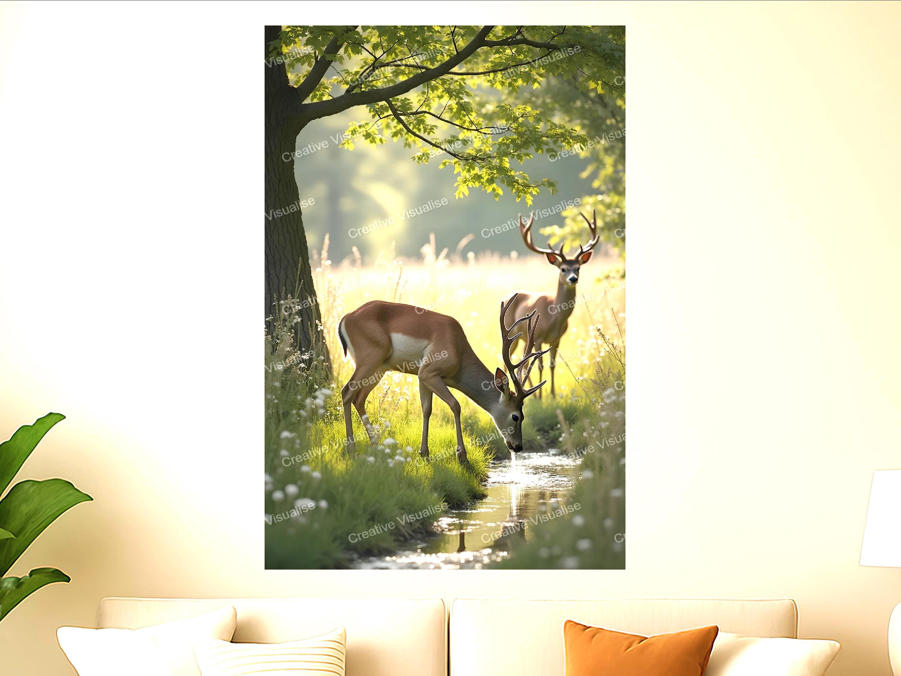 A digital photo of the deer drinking water in the stream landscape that can be easily downloaded and printed (not a physical item for delivery). The details of the digitally received image are about 11000 × 16000 pixels, 300 DPI, JPEG and PDF formats, AI artwork, very high resolution without a watermark, and large enough for professional posters, canvas prints, and wall decor. Please send me a message if you need another file format after the original files' delivery. This price is for personal use! For commercial use, please send me a message.