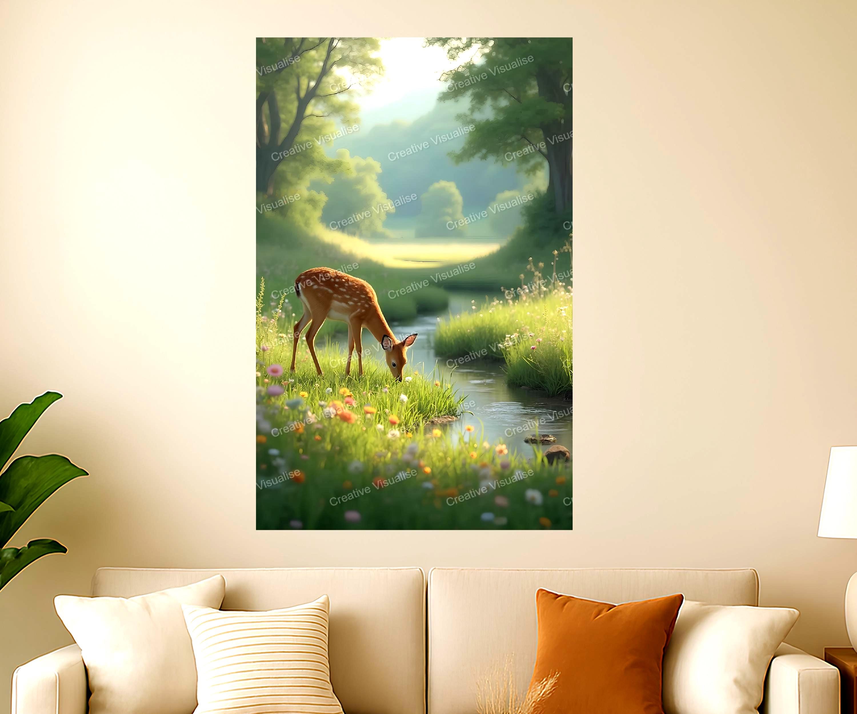 A digital photo of the deer landscape, a photo that can be easily downloaded and printed (not a physical item for delivery). The details of the digitally received image are about 11000 × 16000 pixels, 300 DPI, JPEG and PDF formats, AI artwork, very high resolution without a watermark, and large enough for professional posters, canvas prints, and wall decor. Please send me a message if you need another file format after the original files' delivery. This price is for personal use! For commercial use, please send me a message.