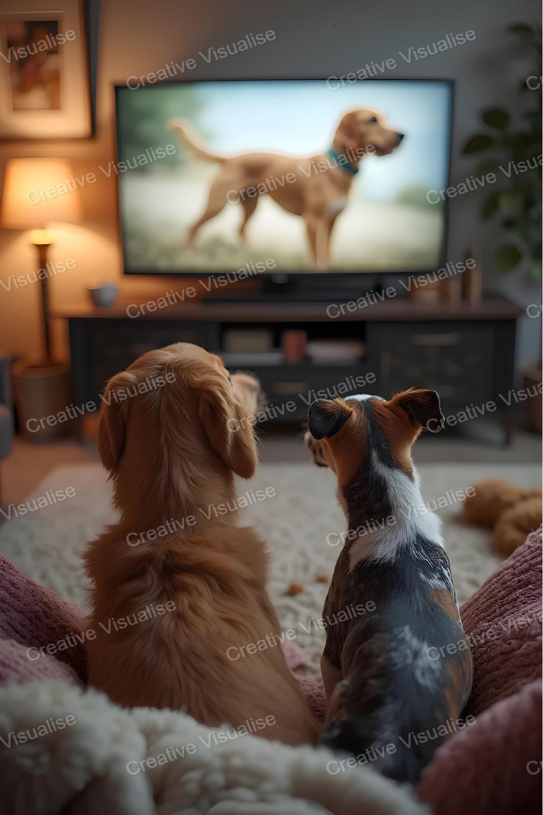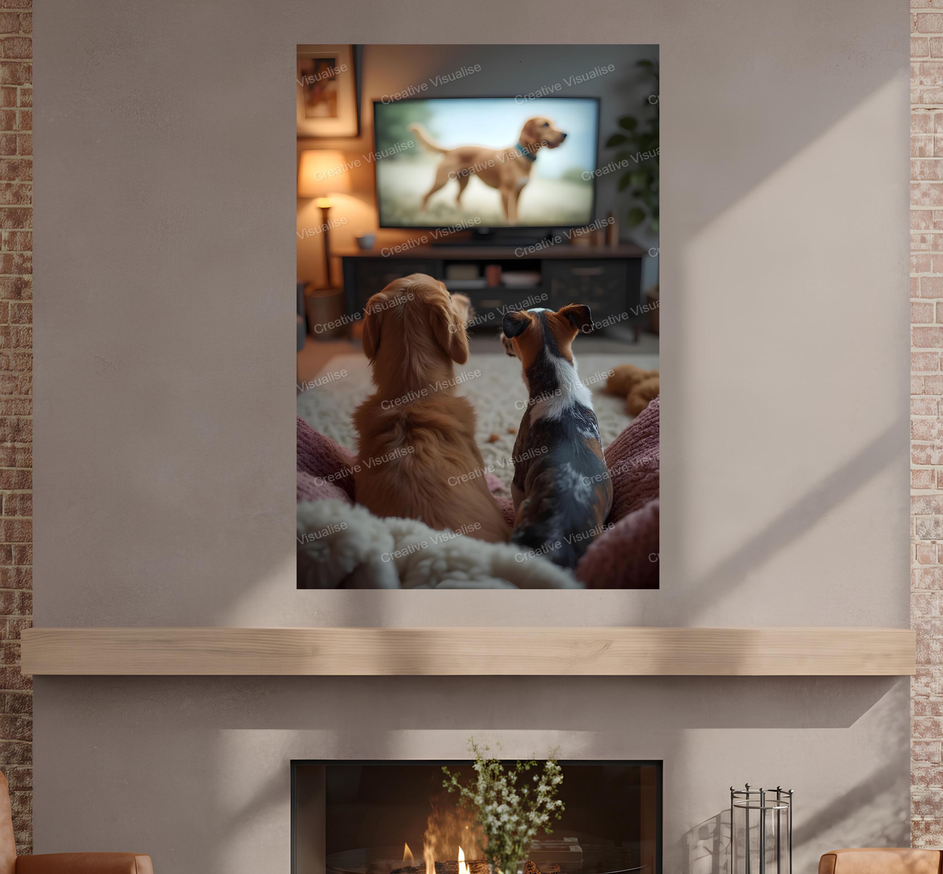 A digital photo of the dogs watching television that can be easily downloaded and printed (not a physical item for delivery). The details of the digitally received image are about 11000 × 16000 pixels, 300 DPI, JPEG and PDF formats, AI artwork, very high resolution without a watermark, and large enough for professional posters, canvas prints, and wall decor. Please send me a message if you need another file format after the original files' delivery. This price is for personal use! For commercial use, please send me a message.
