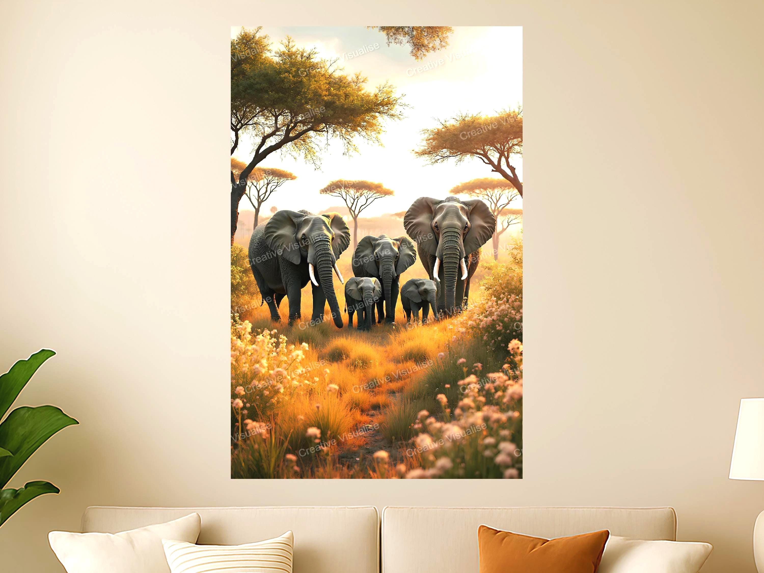 A digital photo of the elephant herd landscape that can be easily downloaded and printed (not a physical item for delivery). The details of the digitally received image are about 11000 × 16000 pixels, 300 DPI, JPEG and PDF formats, AI artwork, very high resolution without a watermark, and large enough for professional posters, canvas prints, and wall decor. Please send me a message if you need another file format after the original files' delivery. This price is for personal use! For commercial use, please send me a message.