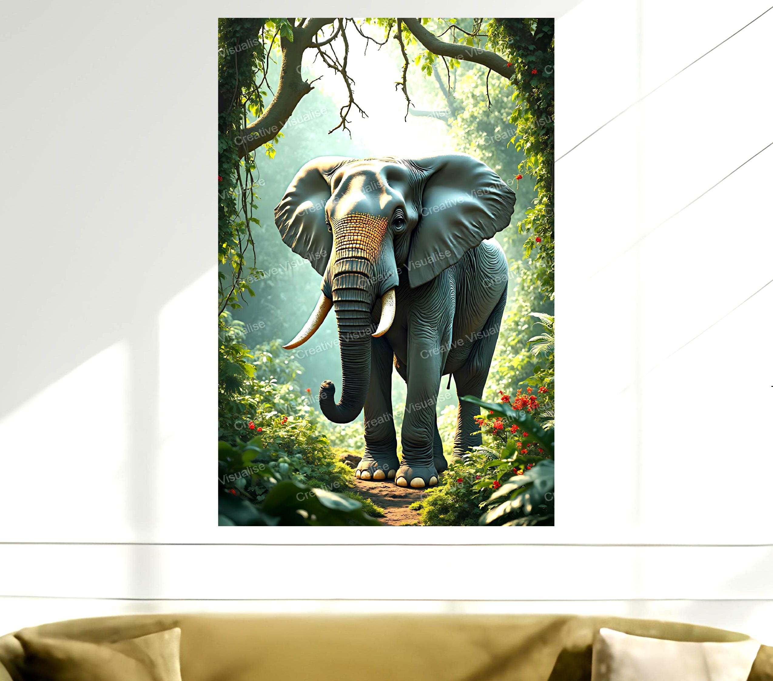 A digital photo of the elephant in the jungle landscape that can be easily downloaded and printed (not a physical item for delivery). The details of the digitally received image are about 11000 × 16000 pixels, 300 DPI, JPEG and PDF formats, AI artwork, very high resolution without a watermark, and large enough for professional posters, canvas prints, and wall decor. Please send me a message if you need another file format after the original files' delivery. This price is for personal use! For commercial use, please send me a message.