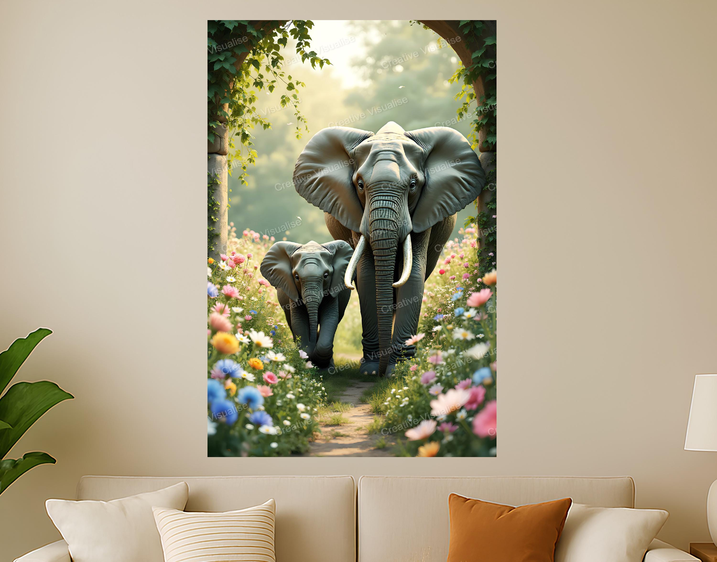 A digital photo of the elephants in the garden landscape that can be easily downloaded and printed (not a physical item for delivery). The details of the digitally received image are about 11000 × 16000 pixels, 300 DPI, JPEG and PDF formats, AI artwork, very high resolution without a watermark, and large enough for professional posters, canvas prints, and wall decor. Please send me a message if you need another file format after the original files' delivery. This price is for personal use! For commercial use, please send me a message.