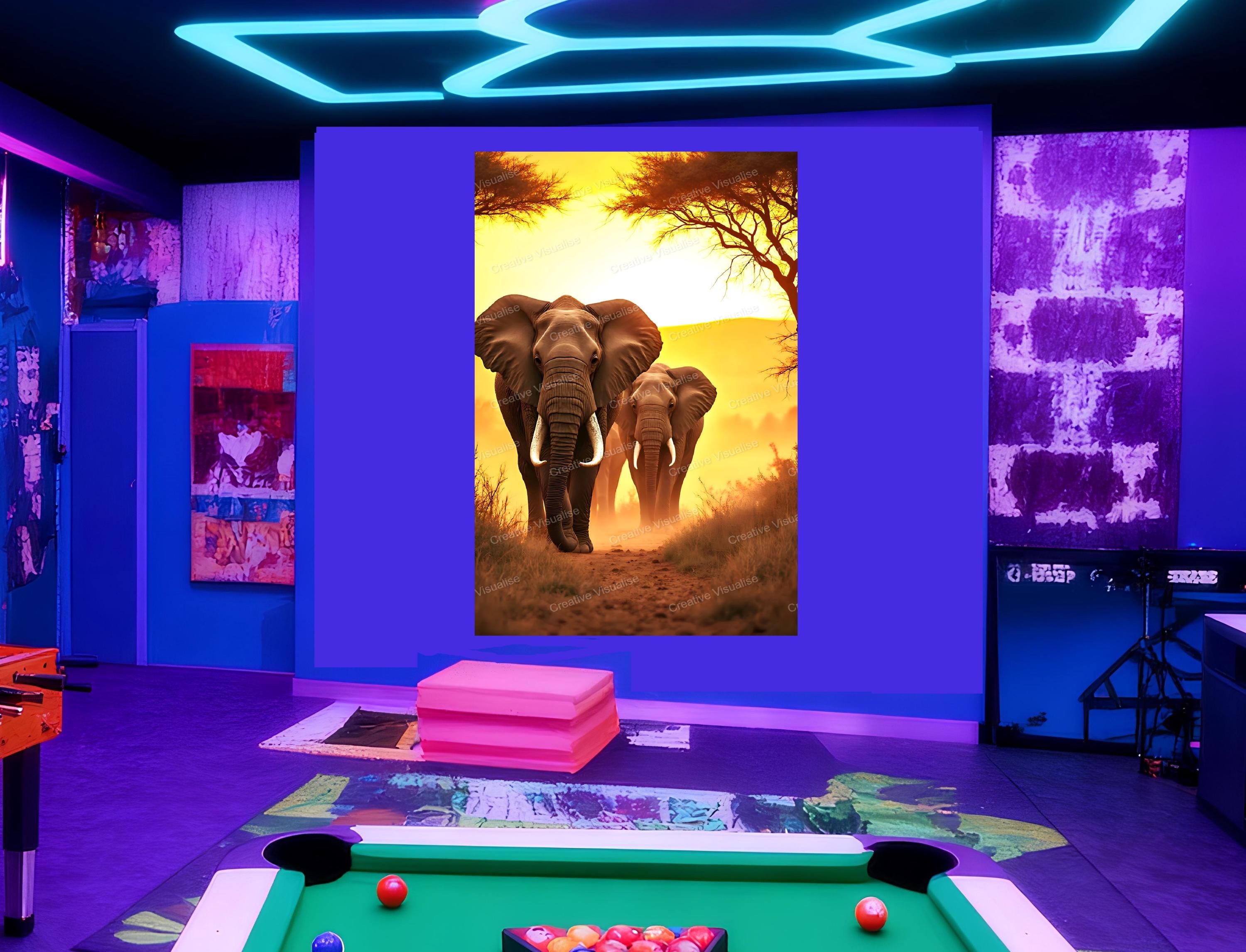 A digital photo of the elephants in the plain landscape that can be easily downloaded and printed (not a physical item for delivery). The details of the digitally received image are about 11000 × 16000 pixels, 300 DPI, JPEG and PDF formats, AI artwork, very high resolution without a watermark, and large enough for professional posters, canvas prints, and wall decor. Please send me a message if you need another file format after the original files' delivery. This price is for personal use! For commercial use, please send me a message.