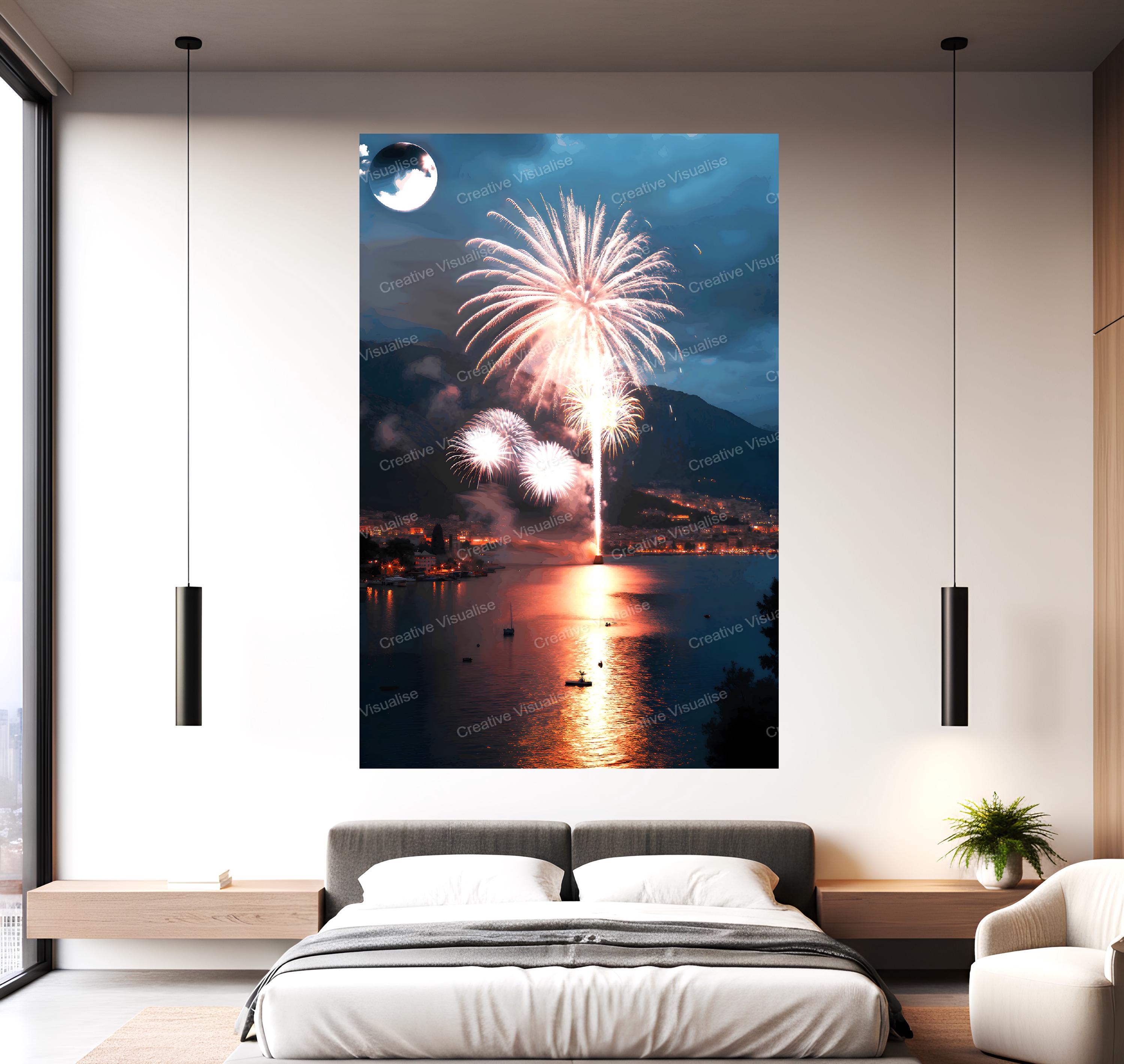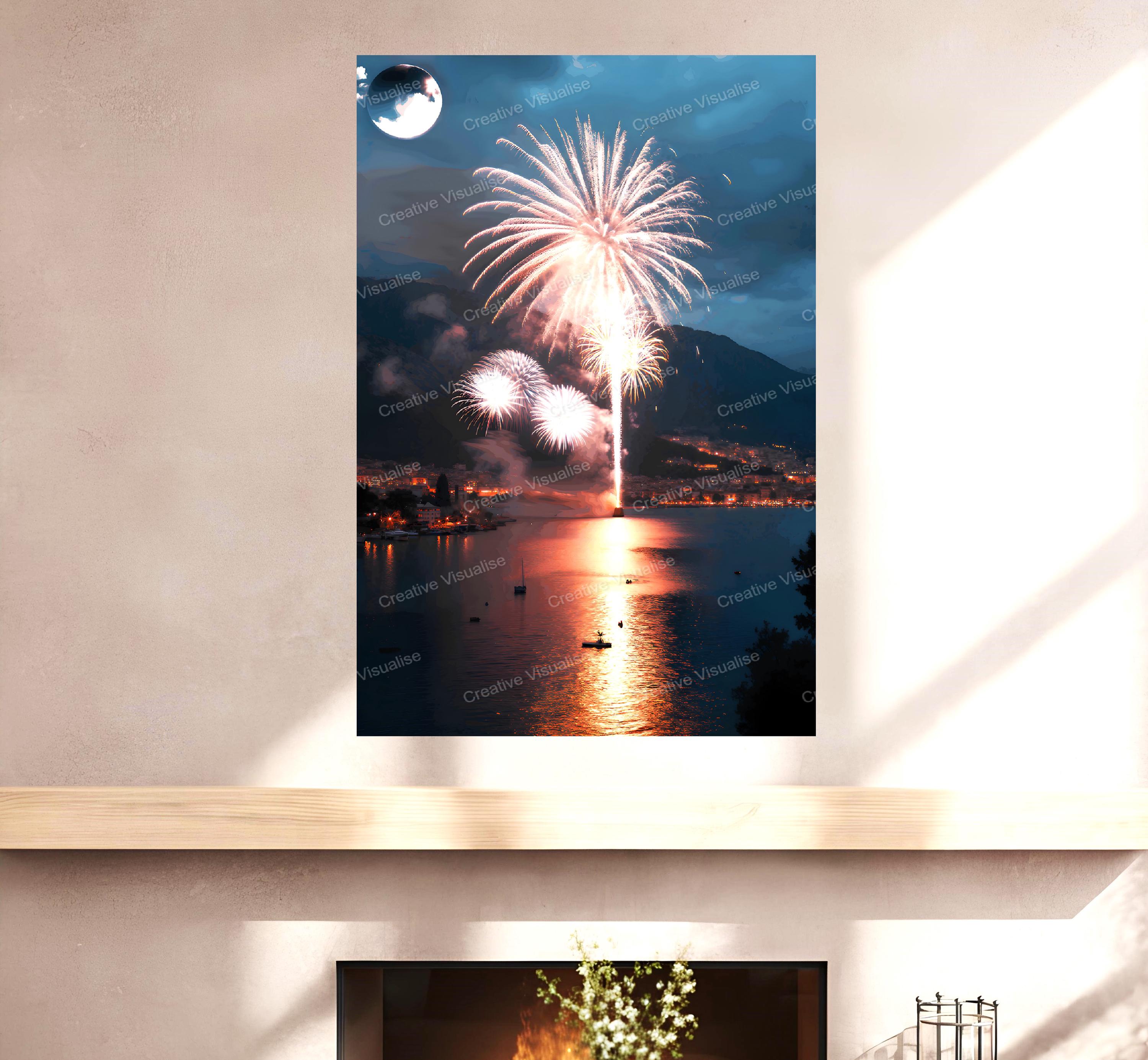 A digital photo of the fireworks celebration in the coastal city that can be easily downloaded and printed (not a physical item for delivery). The details of the digitally received image are about 11000 × 16000 pixels, 300 DPI, JPEG and PDF formats, AI artwork, very high resolution without a watermark, and large enough for professional posters, canvas prints, and wall decor. Please send me a message if you need another file format after the original files' delivery. This price is for personal use! For commercial use, please send me a message.