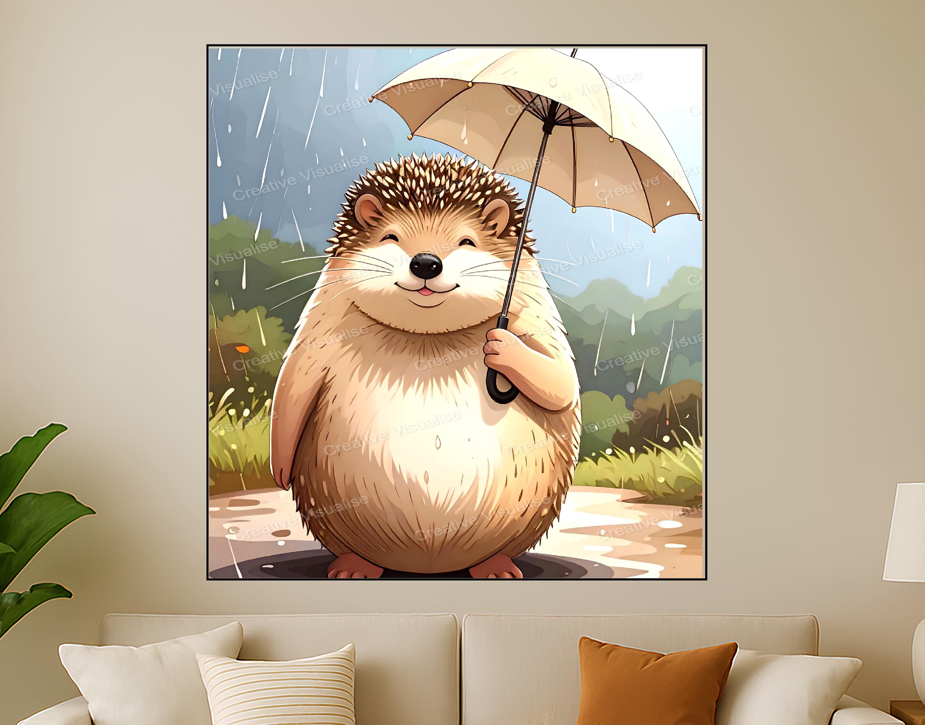 A digital photo of the hedgehog with an umbrella in the rain that can be easily downloaded and printed (not a physical item for delivery). The details of the digitally received image are about 14000 × 14000 pixels, 300 DPI, JPEG and PDF formats, AI artwork, very high resolution without a watermark, and large enough for professional posters, canvas prints, and wall decor. Please send me a message if you need another file format after the original files' delivery. This price is for personal use! For commercial use, please send me a message.