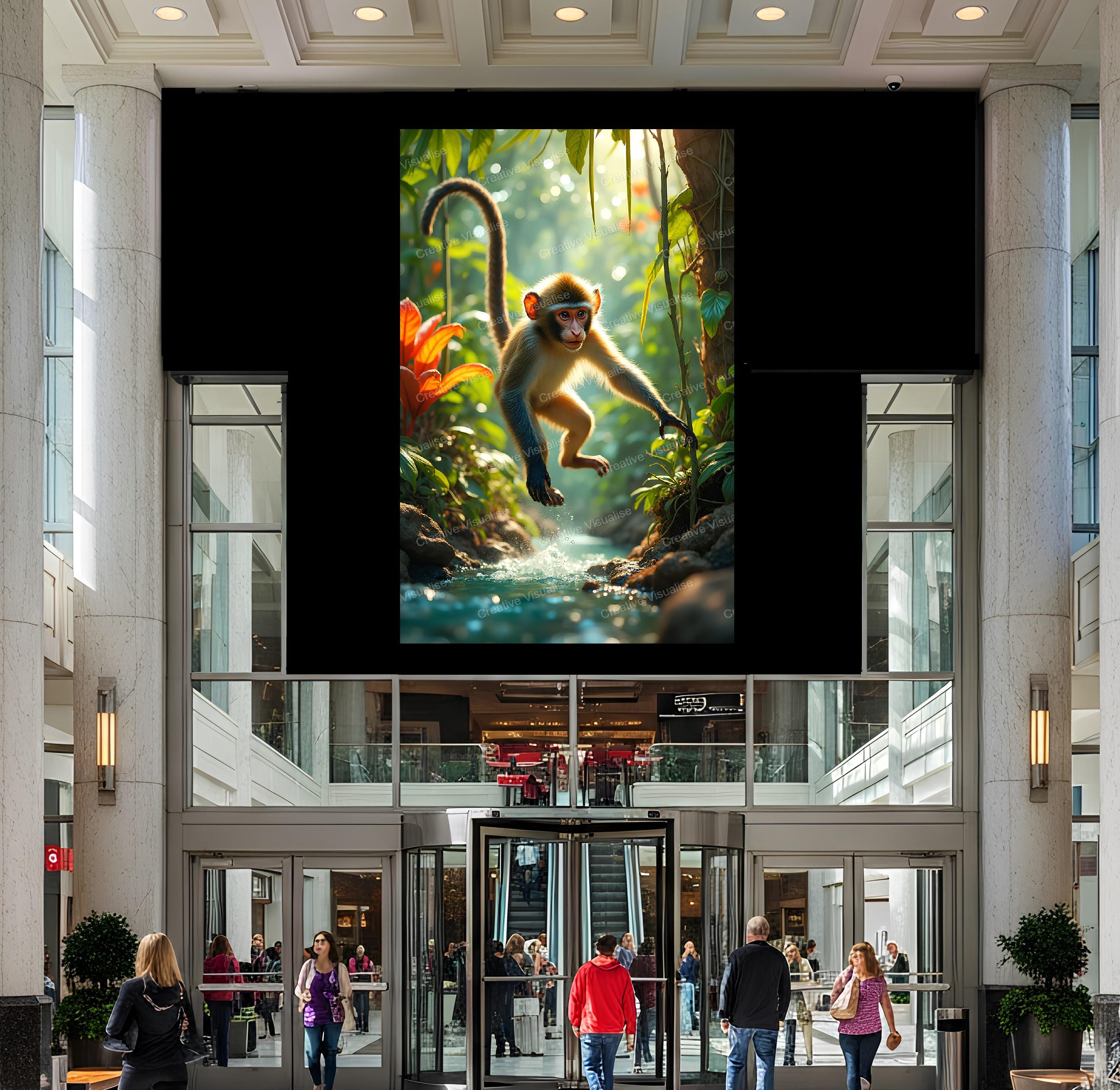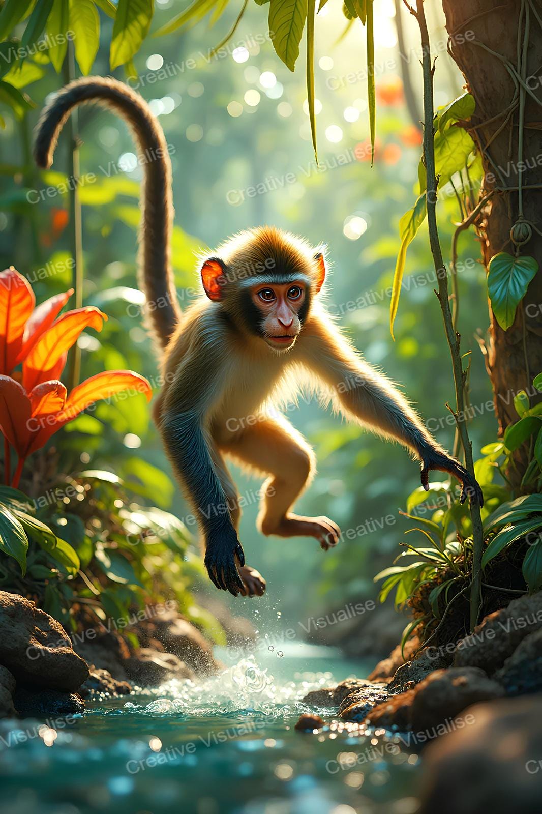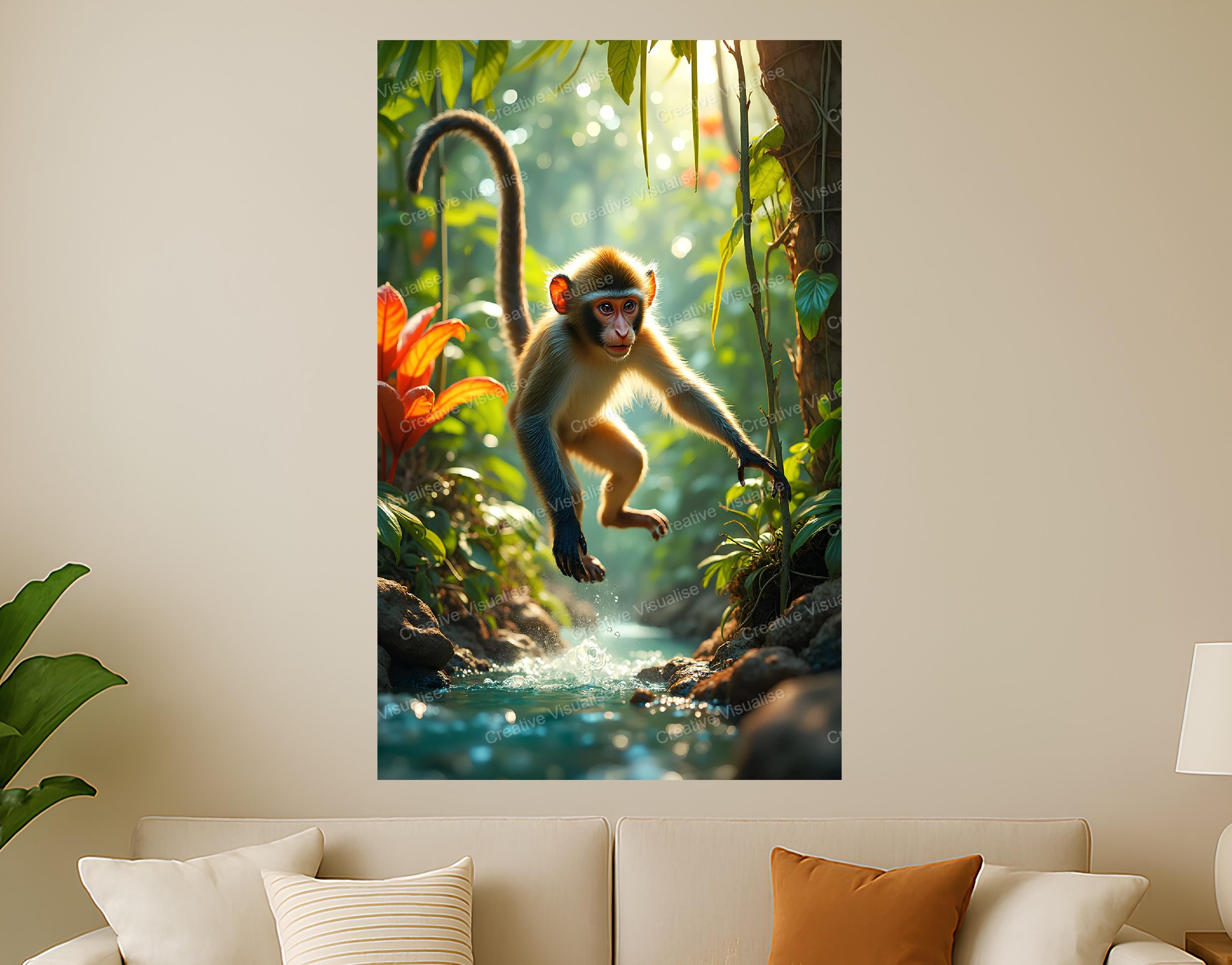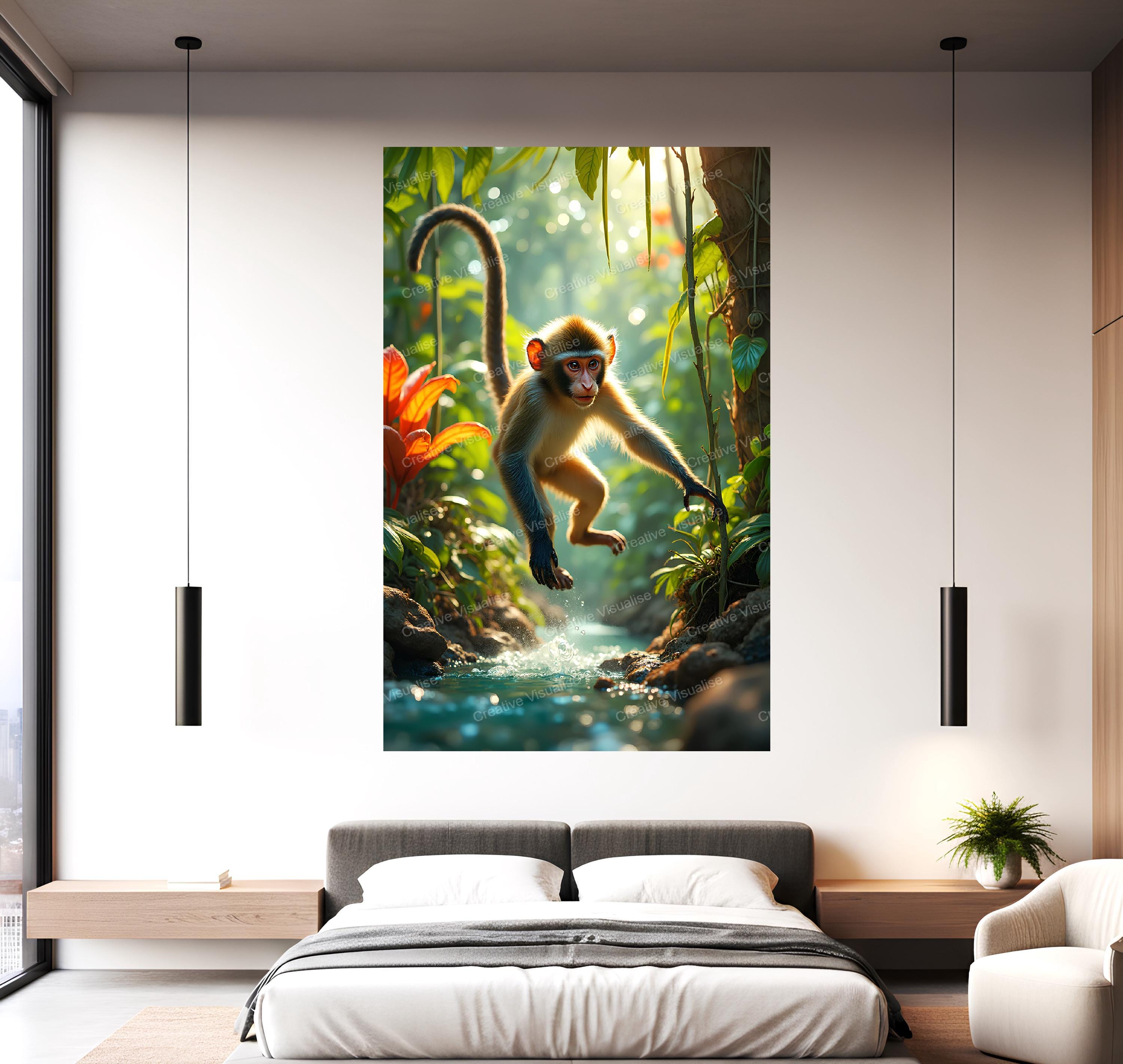 A digital photo of the monkey jumping over water that can be easily downloaded and printed (not a physical item for delivery). The details of the digitally received image are about 11000 × 16000 pixels, 300 DPI, JPEG and PDF formats, AI artwork, very high resolution without a watermark, and large enough for professional posters, canvas prints, and wall decor. Please send me a message if you need another file format after the original files' delivery. This price is for personal use! For commercial use, please send me a message.