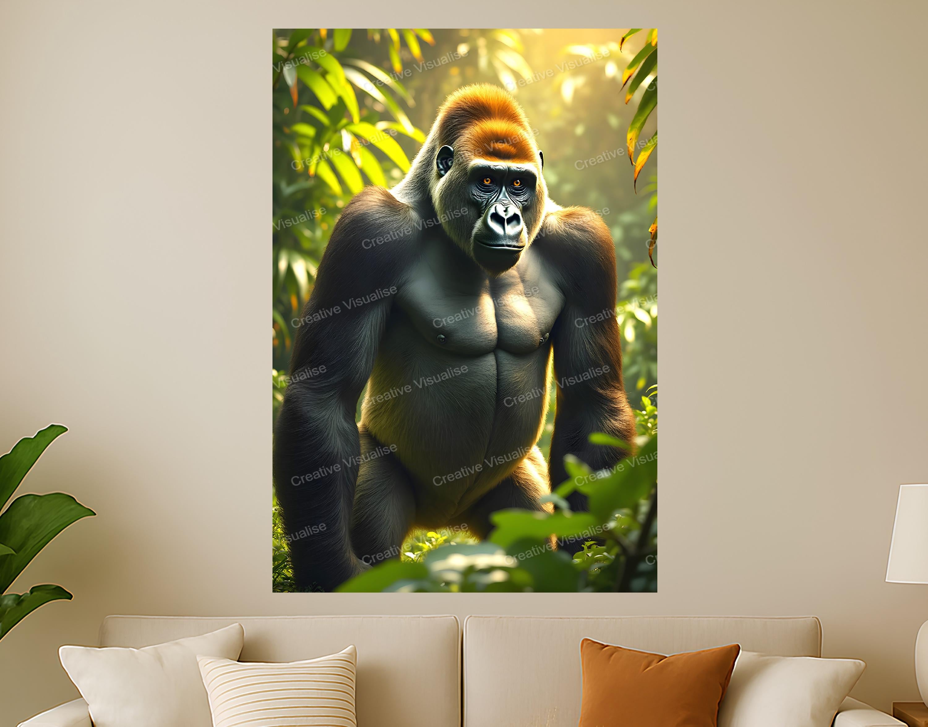A digital photo of the gorilla in the jungle that can be easily downloaded and printed (not a physical item for delivery). The details of the digitally received image are about 11000 × 16000 pixels, 300 DPI, JPEG and PDF formats, AI artwork, very high resolution without a watermark, and large enough for professional posters, canvas prints, and wall decor. Please send me a message if you need another file format after the original files' delivery. This price is for personal use! For commercial use, please send me a message.