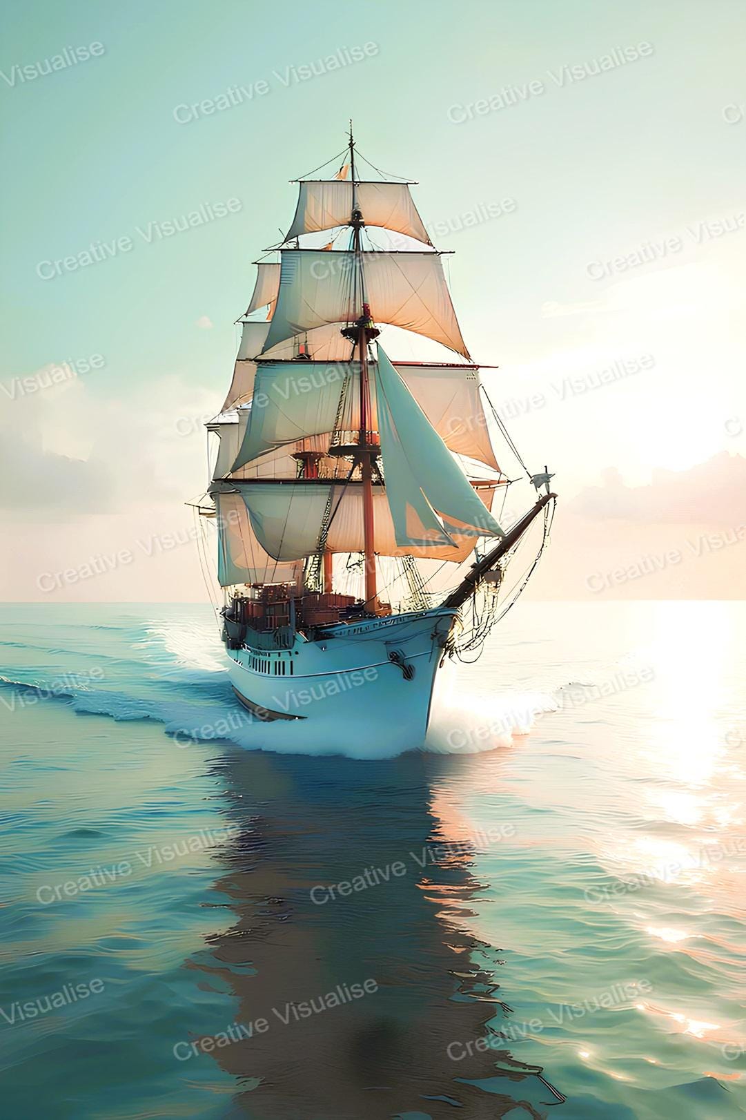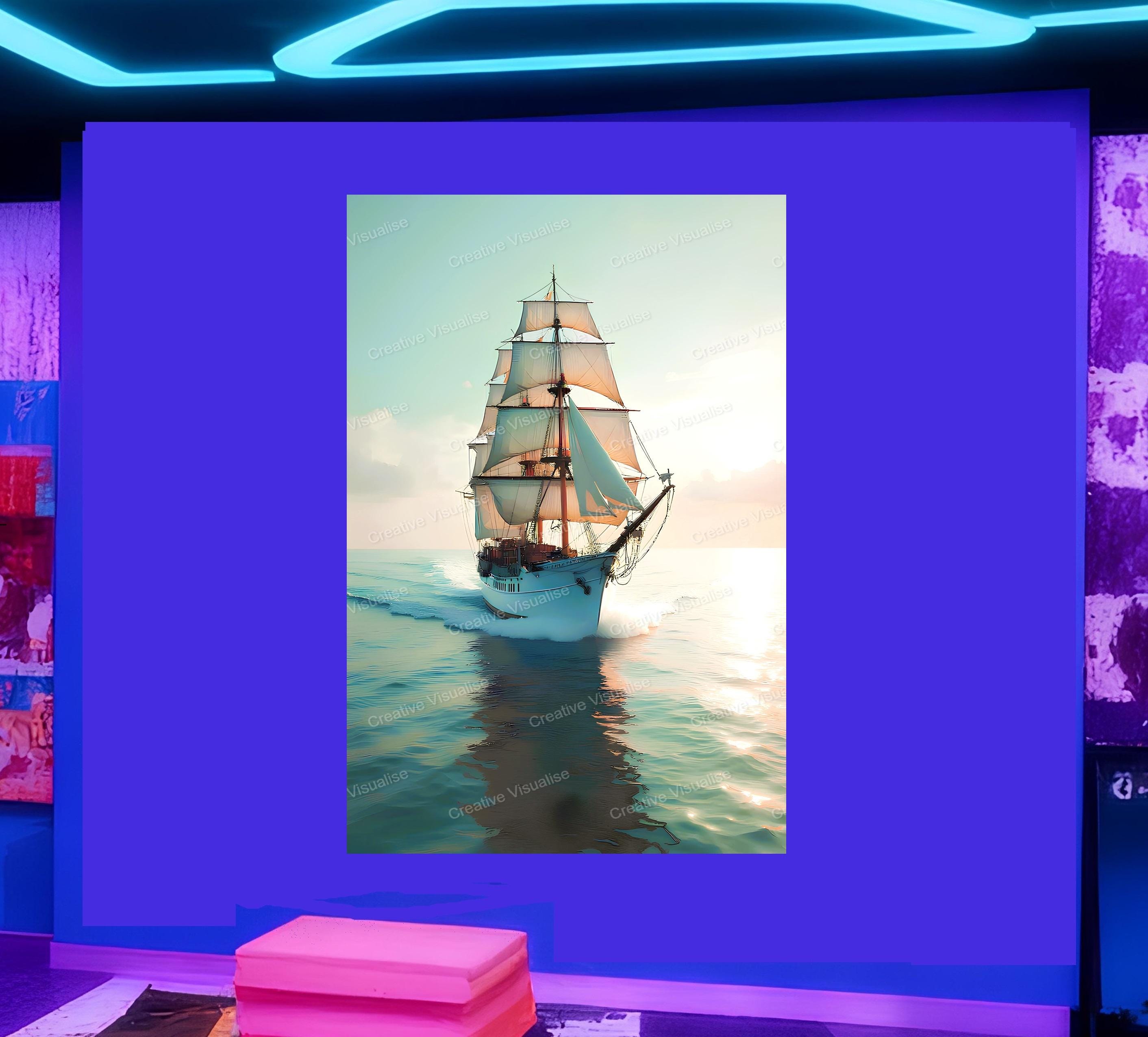 A digital photo of the sailing ship on the sea that can be easily downloaded and printed (not a physical item for delivery). The details of the digitally received image are about 11000 × 16000 pixels, 300 DPI, JPEG and PDF formats, AI artwork, very high resolution without a watermark, and large enough for professional posters, canvas prints, and wall decor. Please send me a message if you need another file format after the original files' delivery. This price is for personal use! For commercial use, please send me a message.