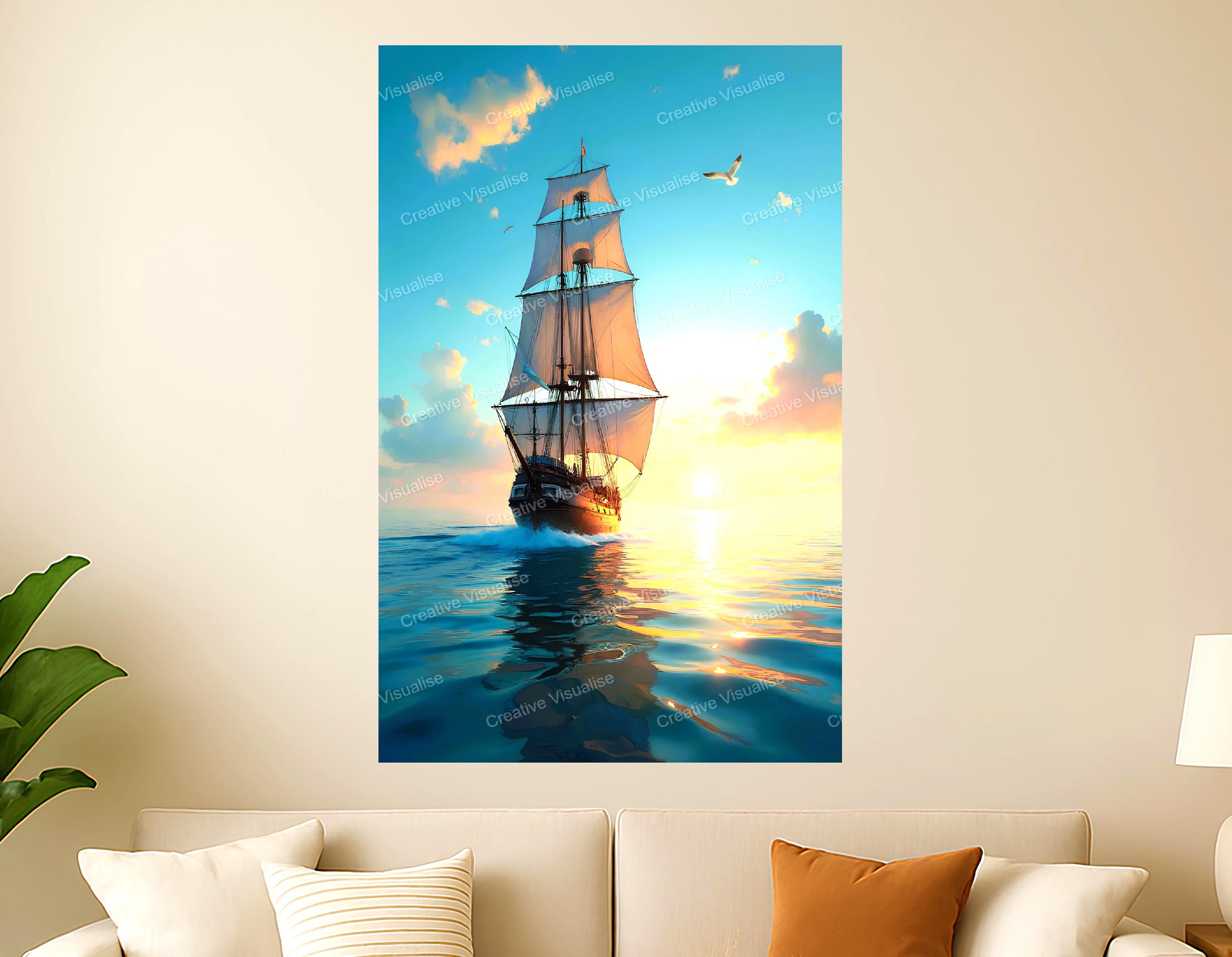 A digital photo of the sailing ship at sunset that can be easily downloaded and printed (not a physical item for delivery). The details of the digitally received image are about 11000 × 16000 pixels, 300 DPI, JPEG and PDF formats, AI artwork, very high resolution without a watermark, and large enough for professional posters, canvas prints, and wall decor. Please send me a message if you need another file format after the original files' delivery. This price is for personal use! For commercial use, please send me a message.